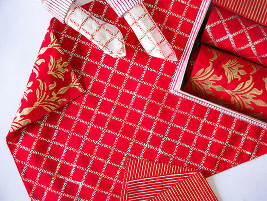 Adya has created a beautiful range of cotton & silk table mats. One set comprises 6 mats, 1 runner, 6 napkins, 6 coasters & 6 napkin rings.