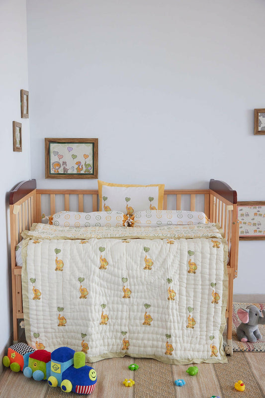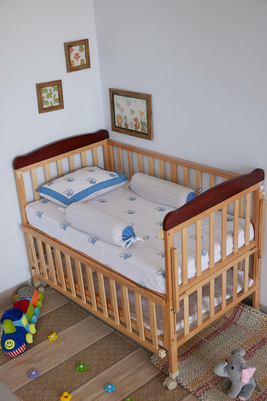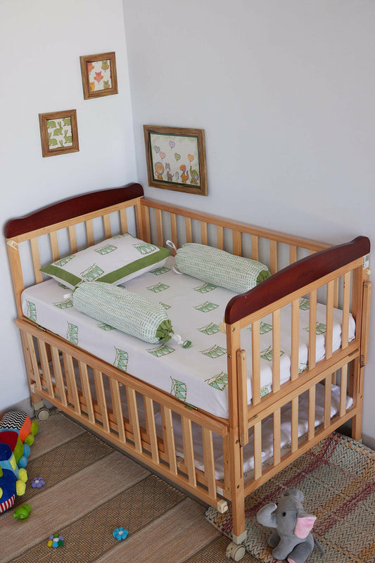 Indulge in the luxurious bliss of these meticulously crafted ensembles, where every detail has been thoughtfully considered to provide the utmost comfort and style for your precious little ones. We have carefully crafted cuddly and cozy cot sets, adorned with delightful baby prints, to create a warm and inviting space for your bundle of joy. Each cot set includes an overlay sheet, one pillow case, and two bolster covers, providing everything you need for a comfortable and stylish nursery.