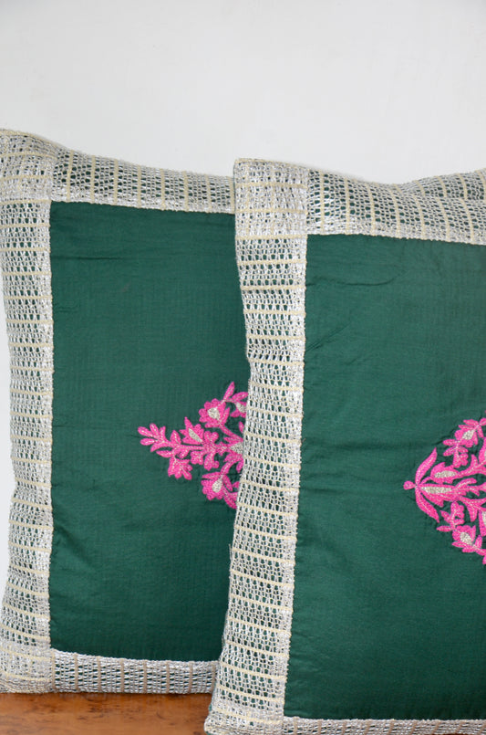Ultramarine Green Silver Zari Embroidered Cushion Cover