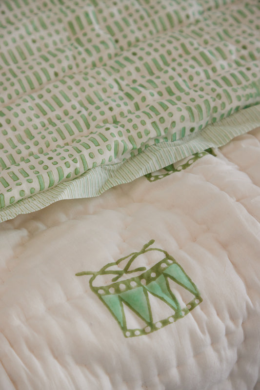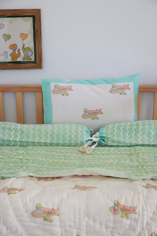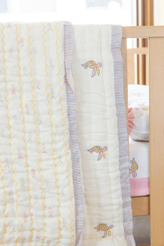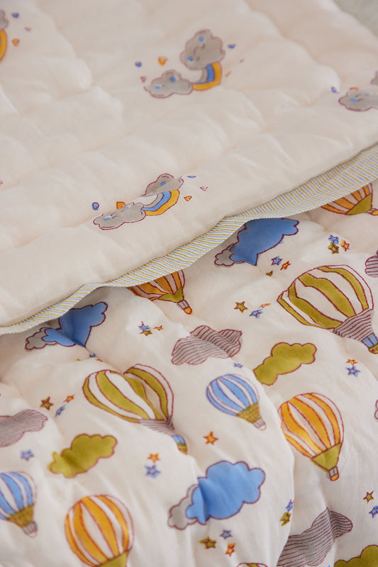 To enhance comfort and charm, we offer quilt that perfectly complement the cot sets. Made from natural soft cotton fabrics, these pieces ensure ultimate comfort for your little one while stimulating their senses with soothing and colorful prints.