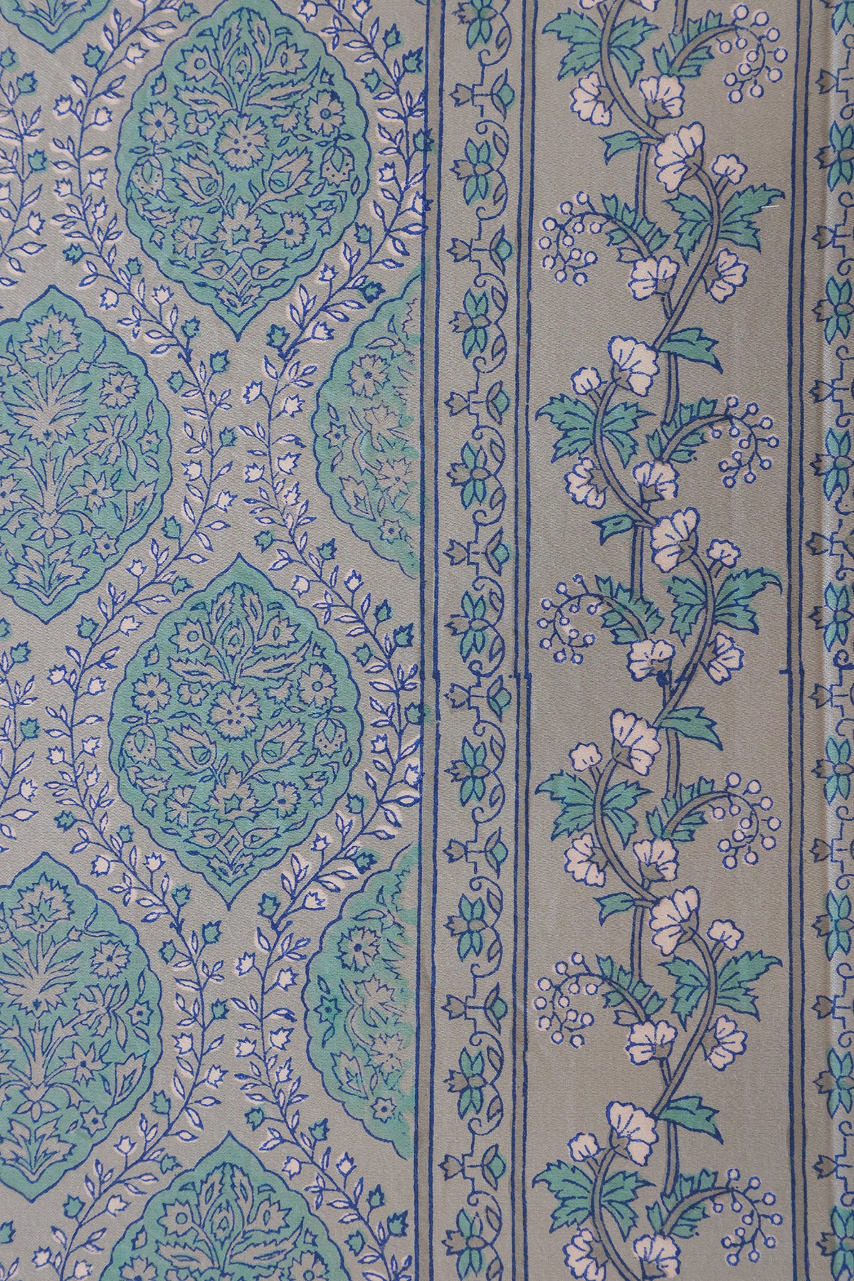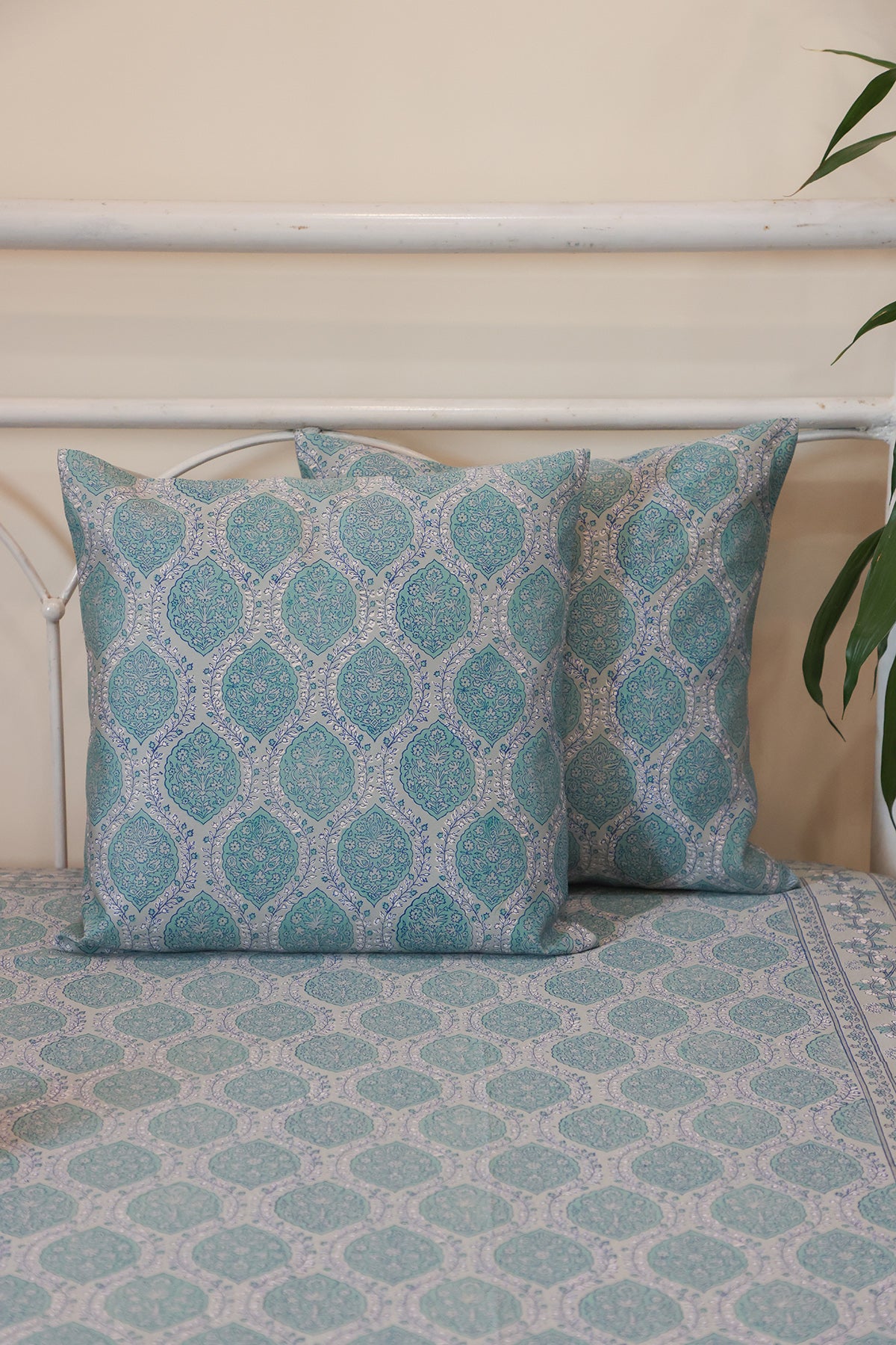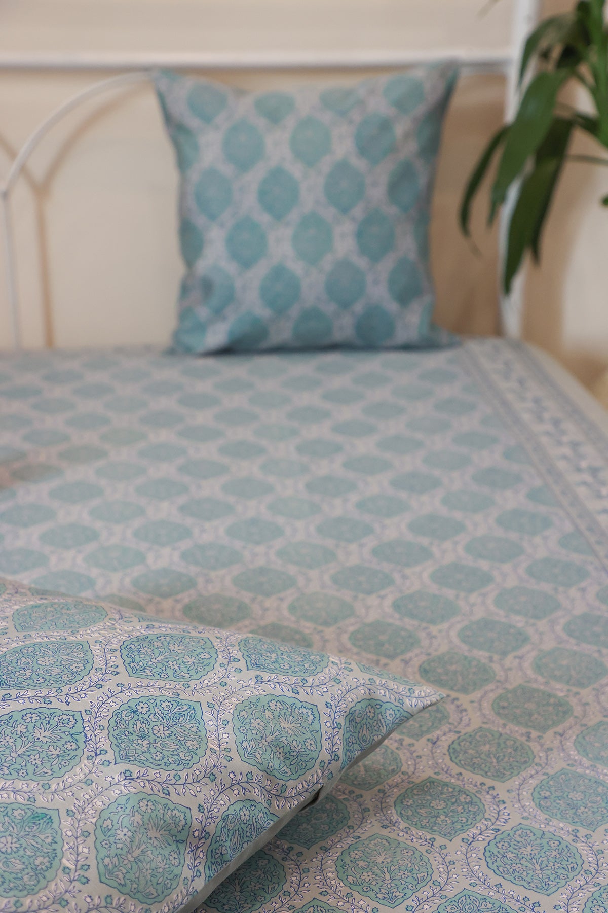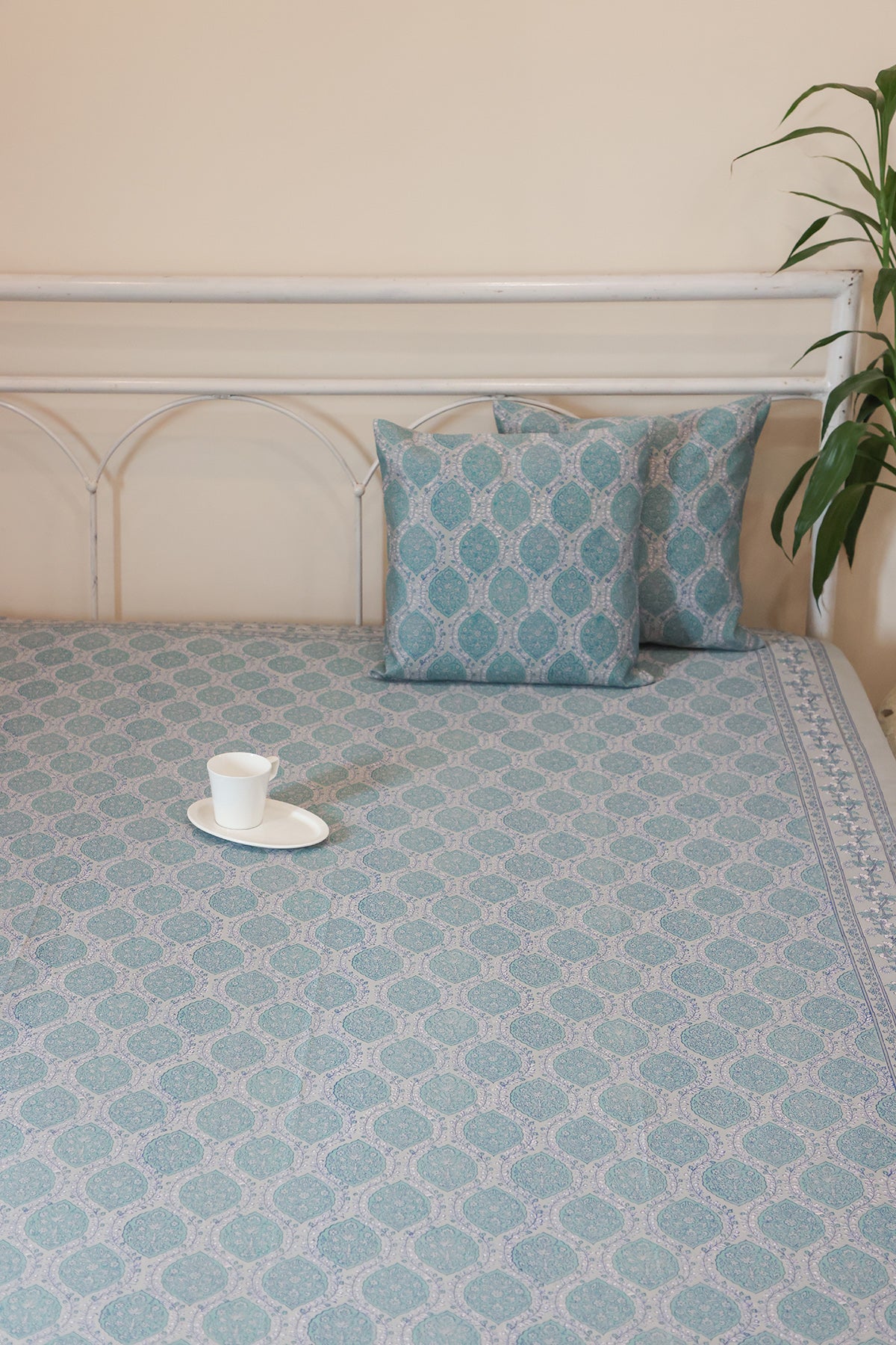 Creamy soft cotton bedcover intricately hand block printed with soothing flowers. Comes with two hand block printed cushion covers.