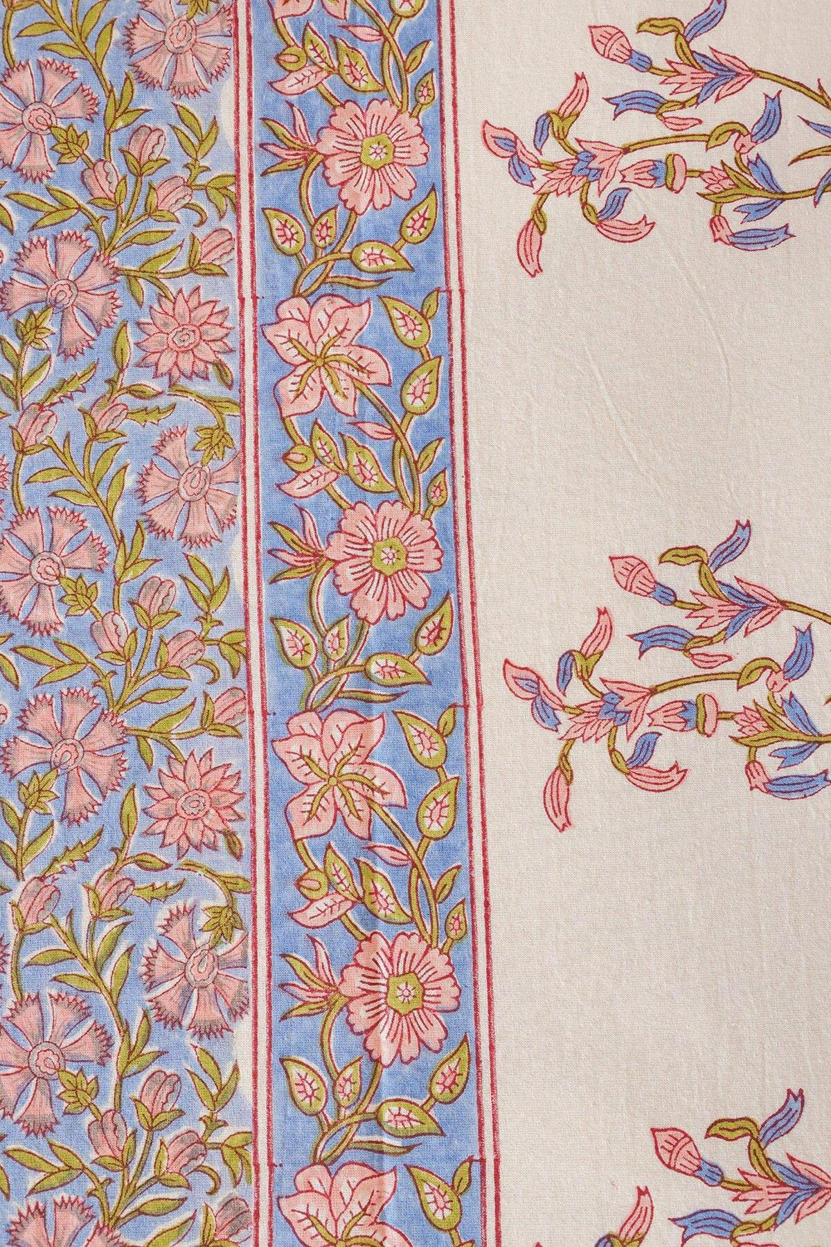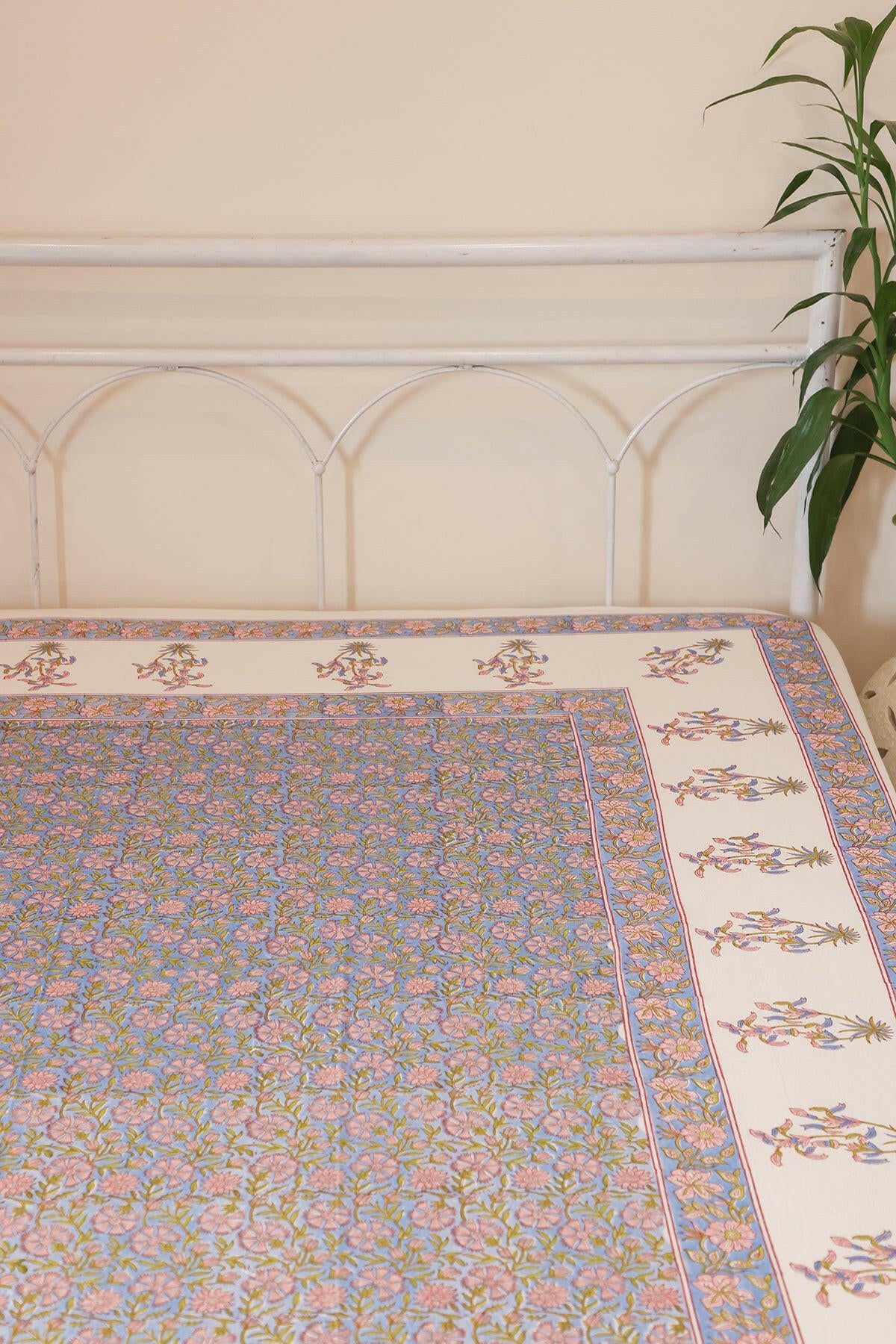 Creamy soft cotton bedcover intricately hand-block printed with soothing flowers. Comes with two hand-block printed cushion covers.