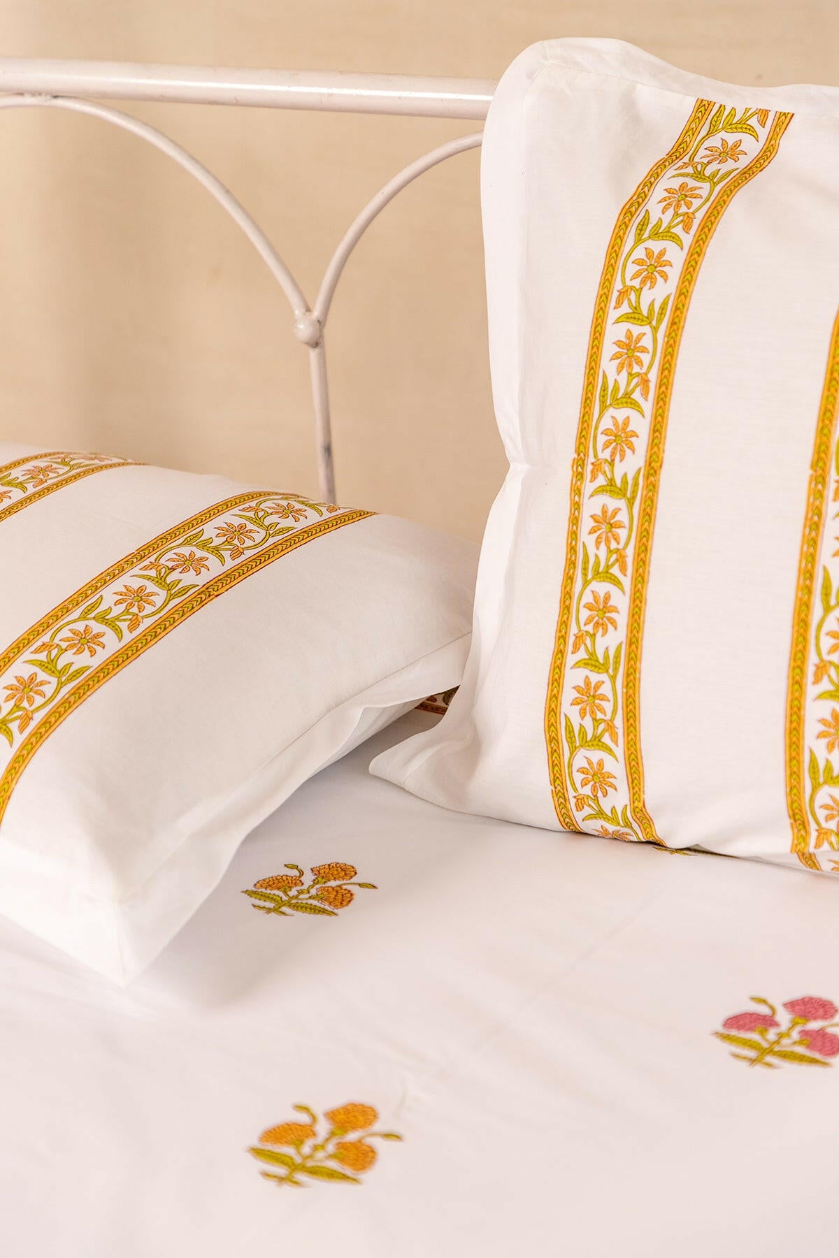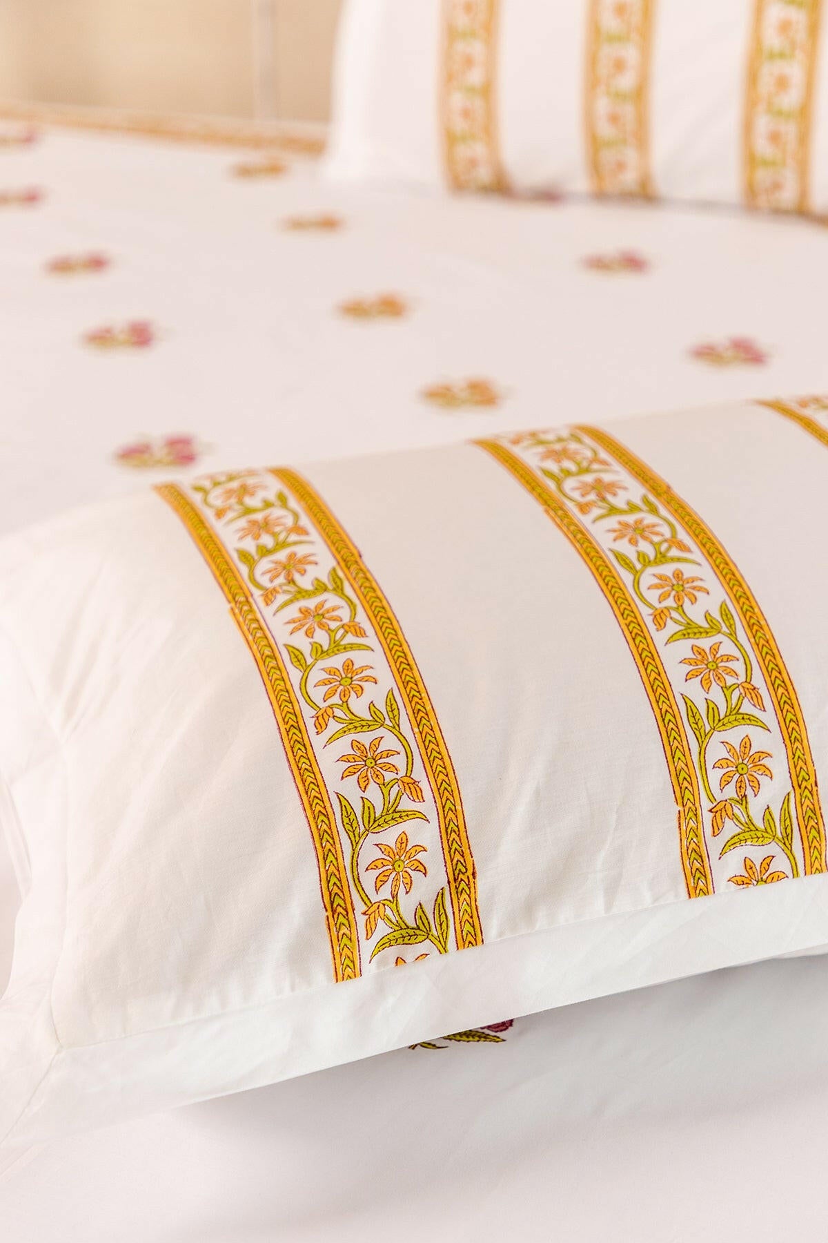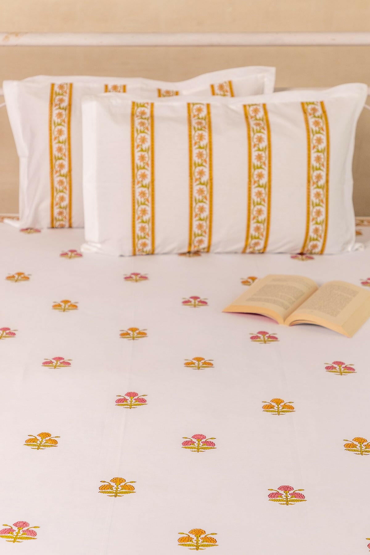 Experience the luxurious comfort of our 100% cotton bed sheet, beautifully hand-block printed with a variety of intricate designs. The bedsheet comes with matching pillow cases (18 IN X 28 IN).