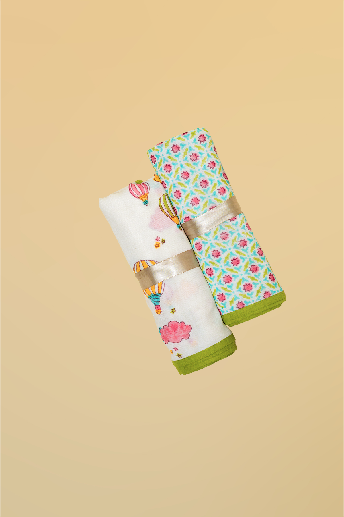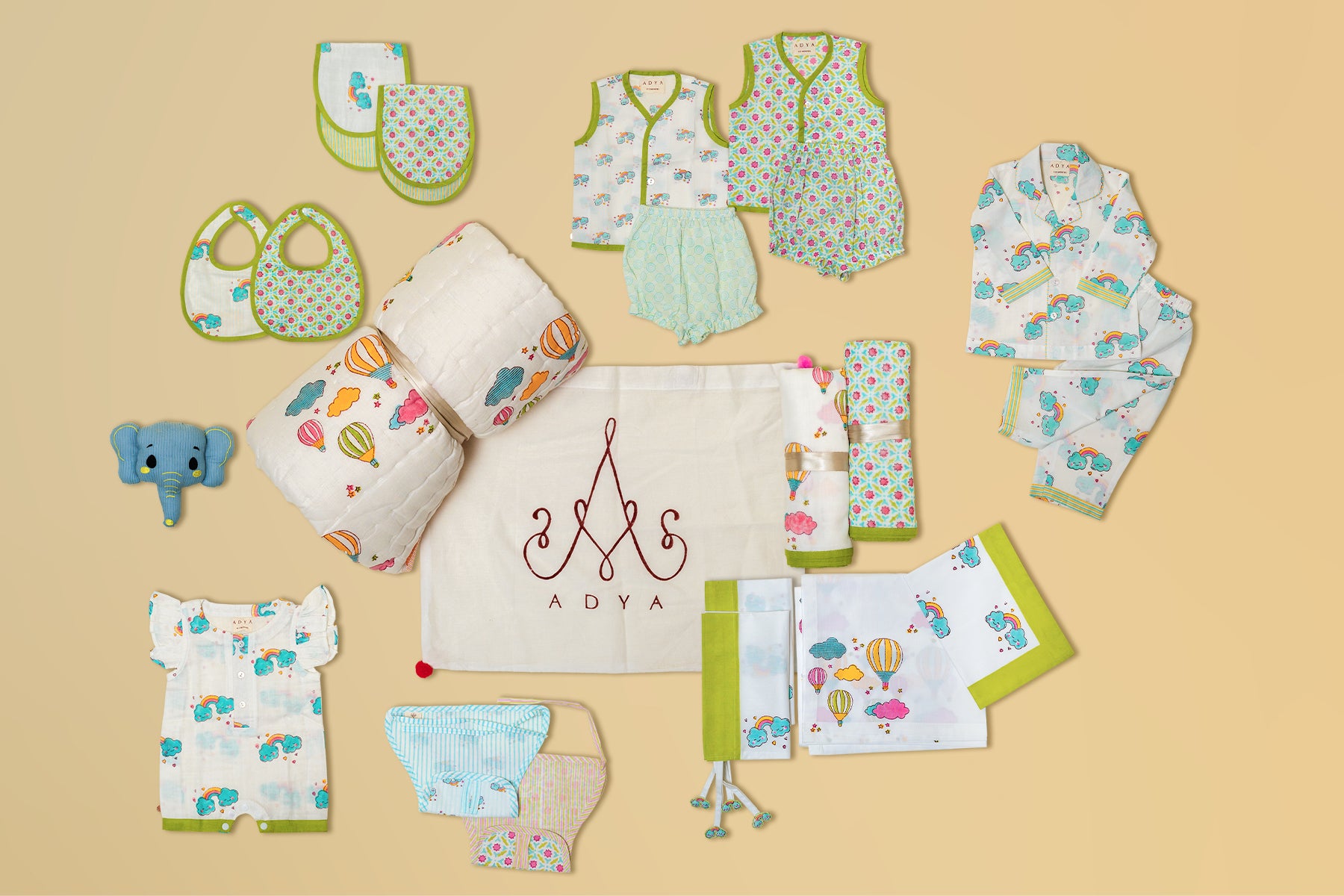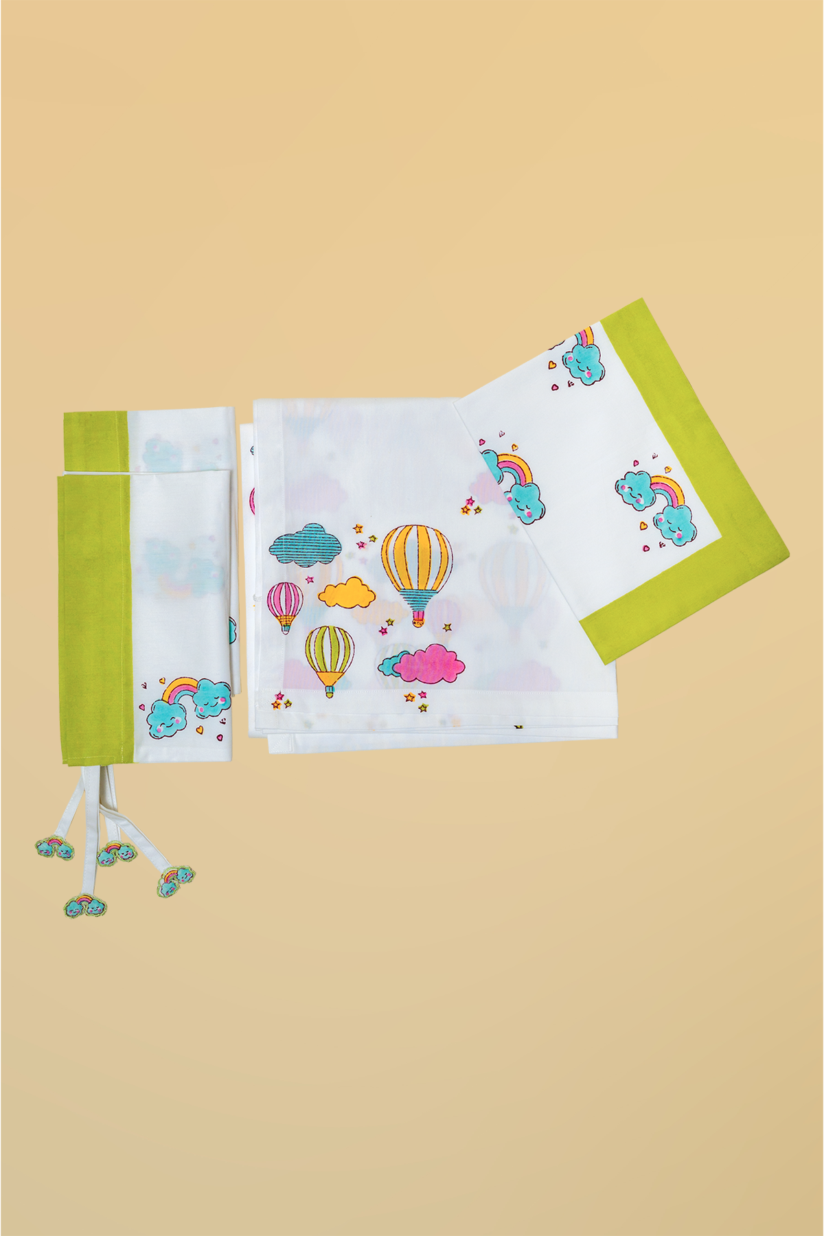 Full Cot Set: Complete baby being set including 1 cot sheet, 2 bolster covers, 1 pillow case, 1 Dohar, 1 Quilt