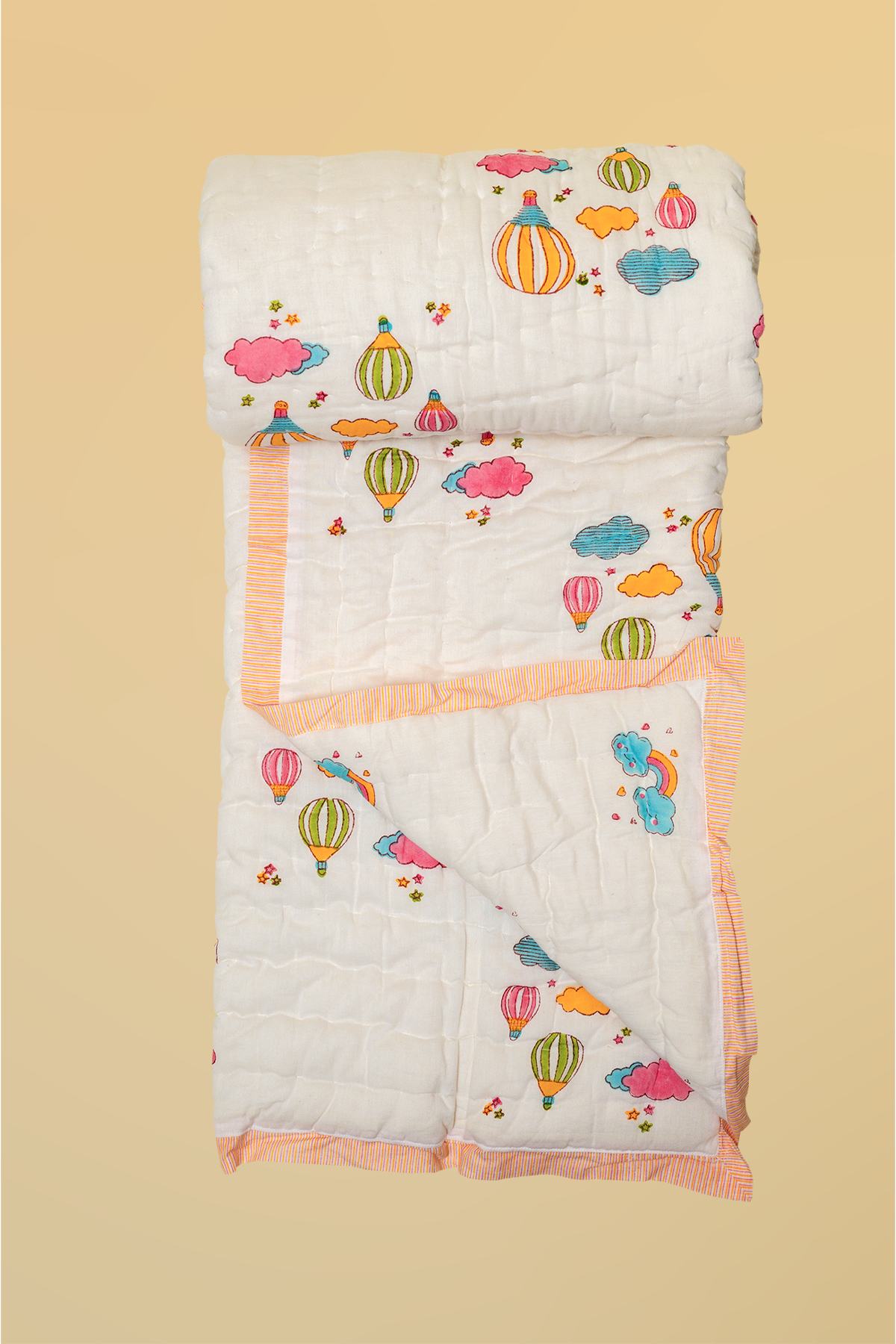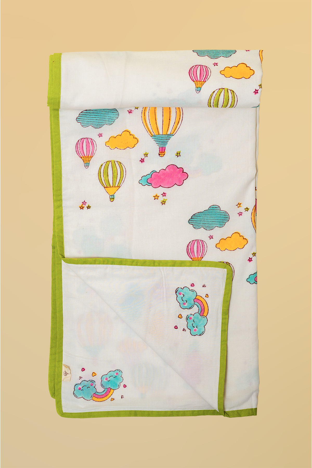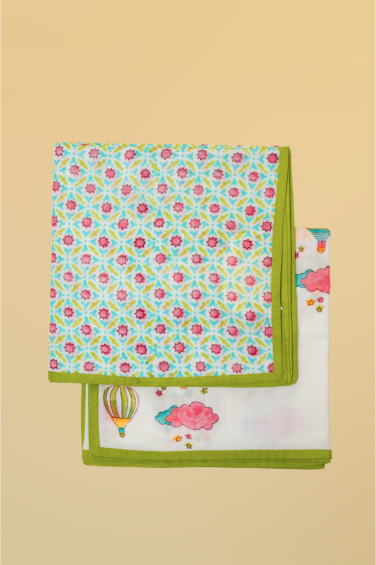 Full Cot Set: Complete baby being set including 1 cot sheet, 2 bolster covers, 1 pillow case, 1 Dohar, 1 Quilt