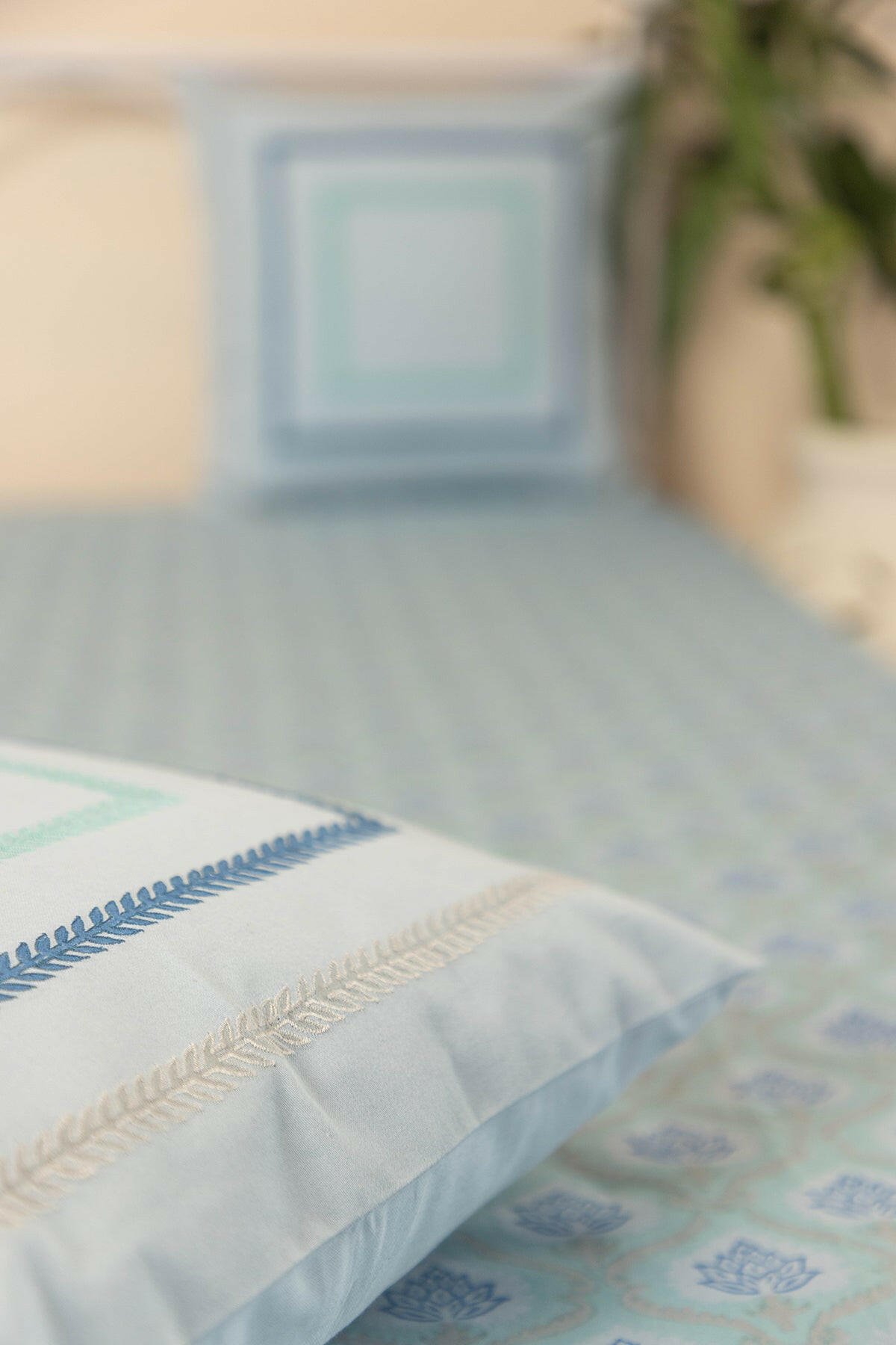 Creamy soft cotton bedcover intricately hand block printed with soothing flowers. Comes with two hand block printed cushion covers.