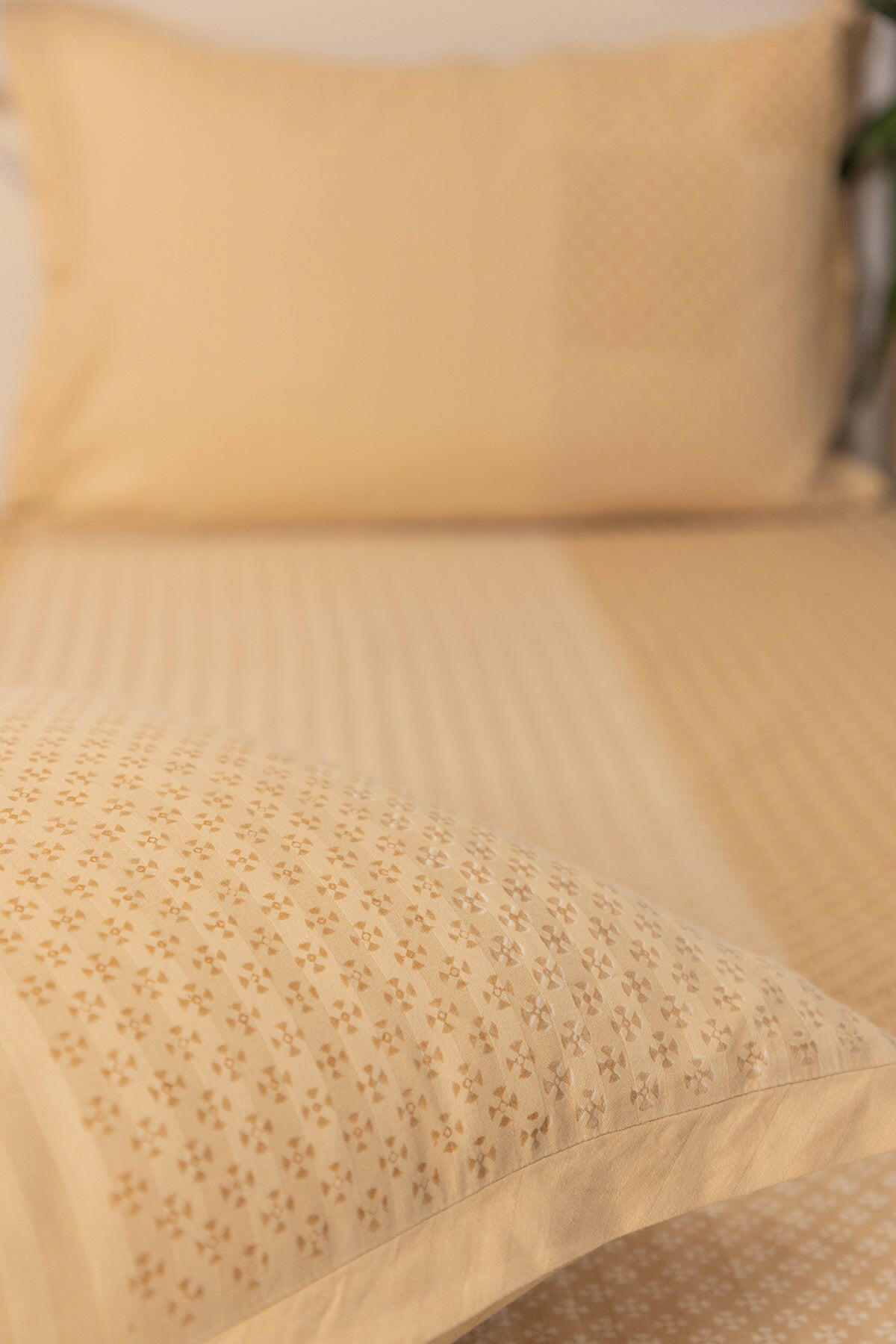 Creamy soft cotton bedcover intricately hand block printed with soothing flowers. Comes with two hand block printed cushion covers.