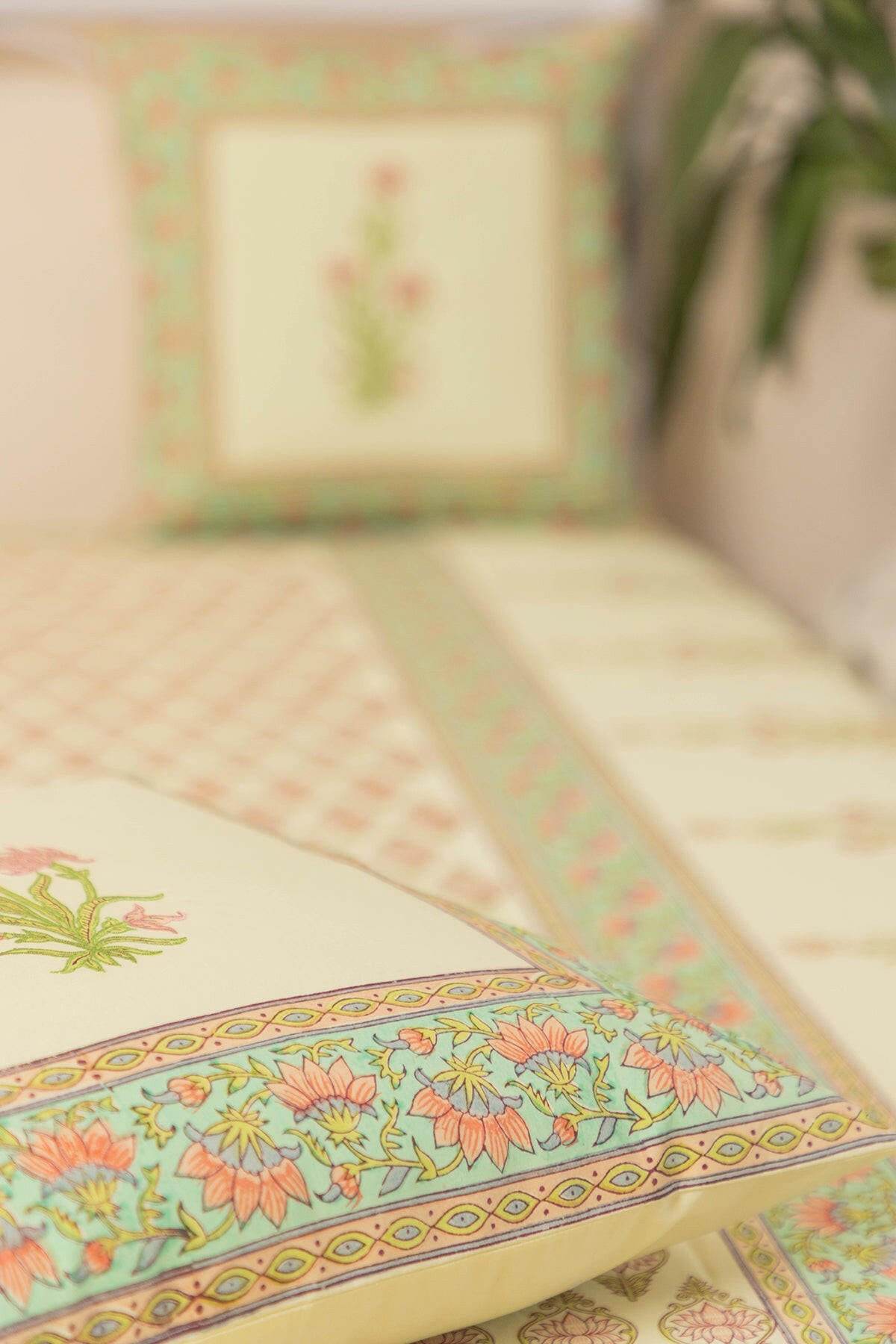 Creamy soft cotton bedcover intricately hand block printed with soothing flowers. Comes with two hand block printed cushion covers.