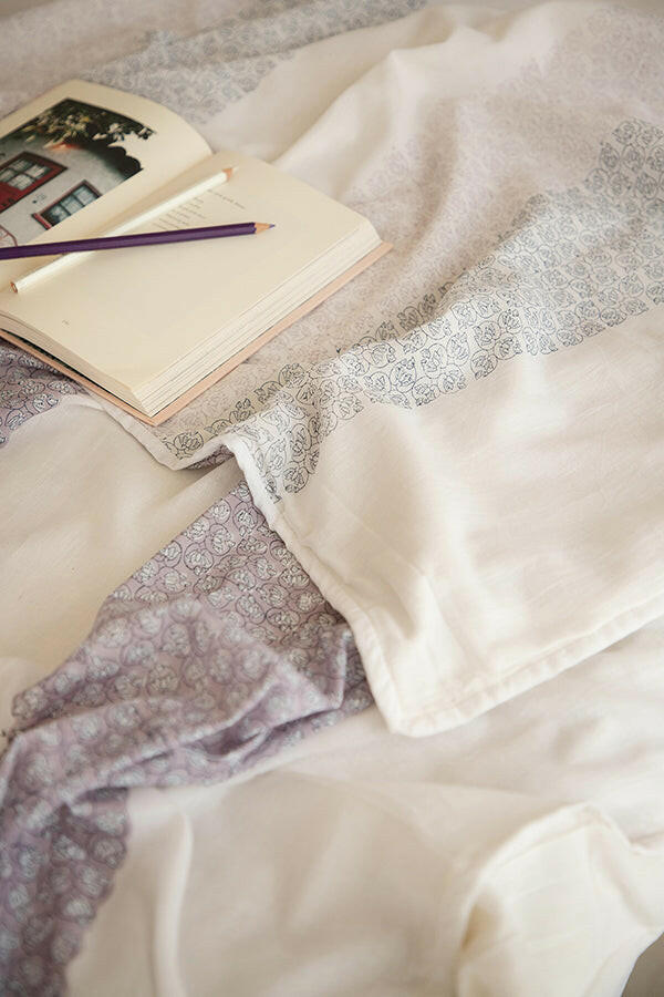 Soft and maintenance free, the double sided muslin dohar hand block printed with tiny lotus flowers is not just for snuggling up. They also serve as a versatile accessory to enhance your home decor. Whether draped over your bed as an eye catching coverlet or spread across your couch as a statement piece, our dohars effortlessly elevate the aesthetic of any space.