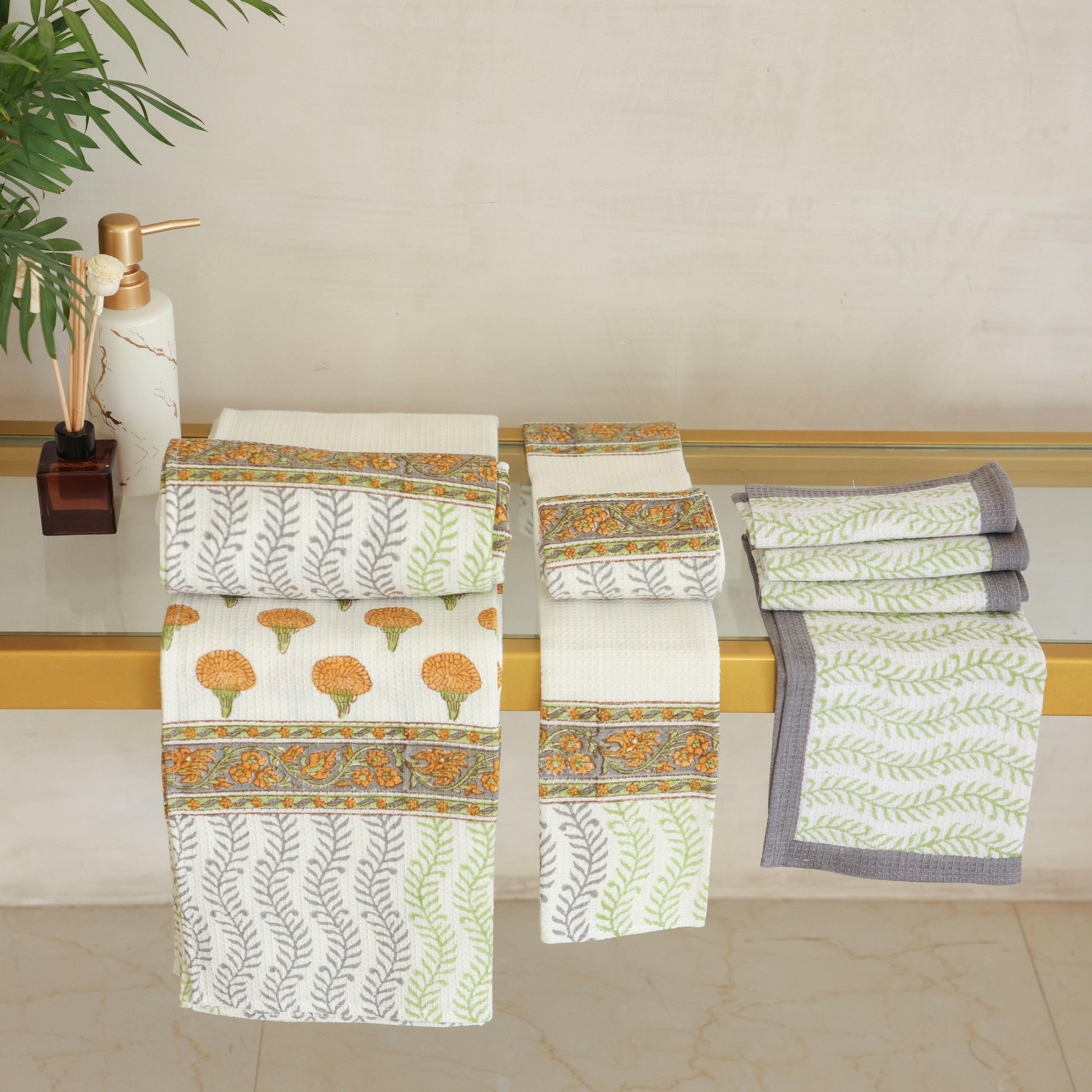 The hall mark of our towels is our distinctive marigold texture, which not only adds a touch of sophistication but also enhances their absorbent capabilities.These towels not only elevates your bathroom aesthetics but also allows you to maintain their pristine effort with minimal effort.