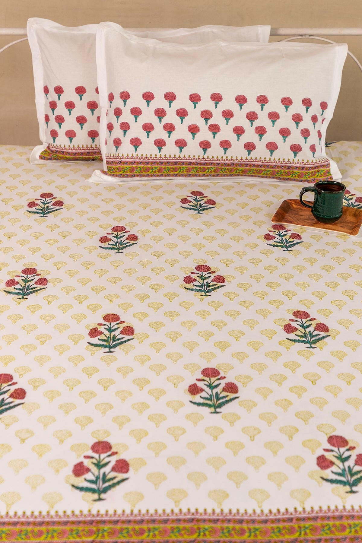Experience the luxurious comfort of our 100% cotton bed sheet, beautifully hand-block printed with a variety of intricate designs. The bedsheet comes with matching pillow cases (18 IN X 28 IN).