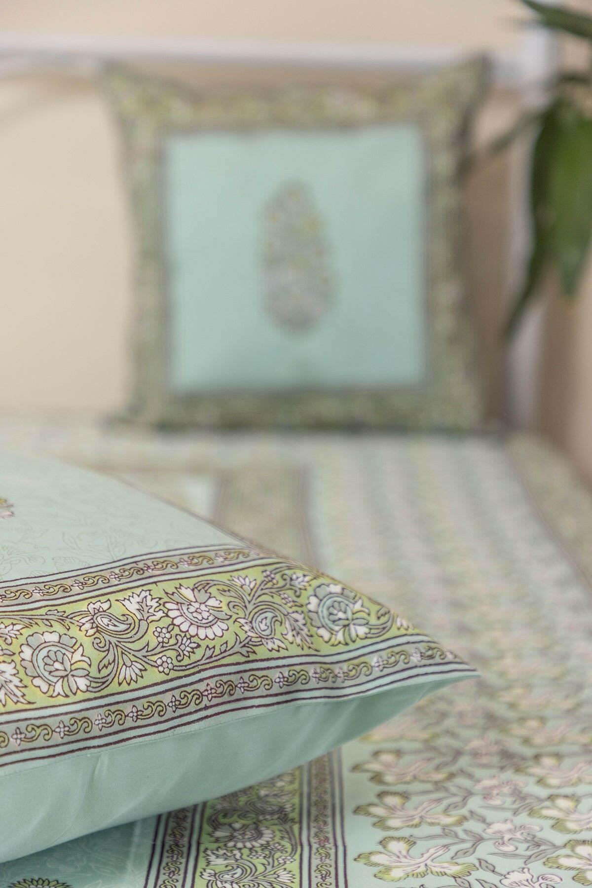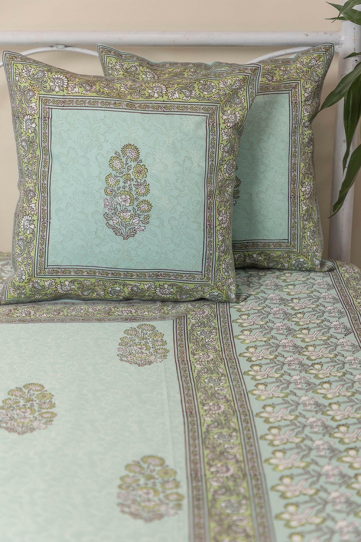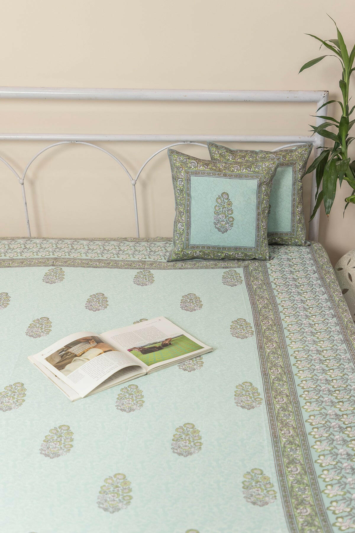 Creamy soft cotton bedcover intricately hand block printed with soothing flowers. Comes with two hand block printed cushion covers.