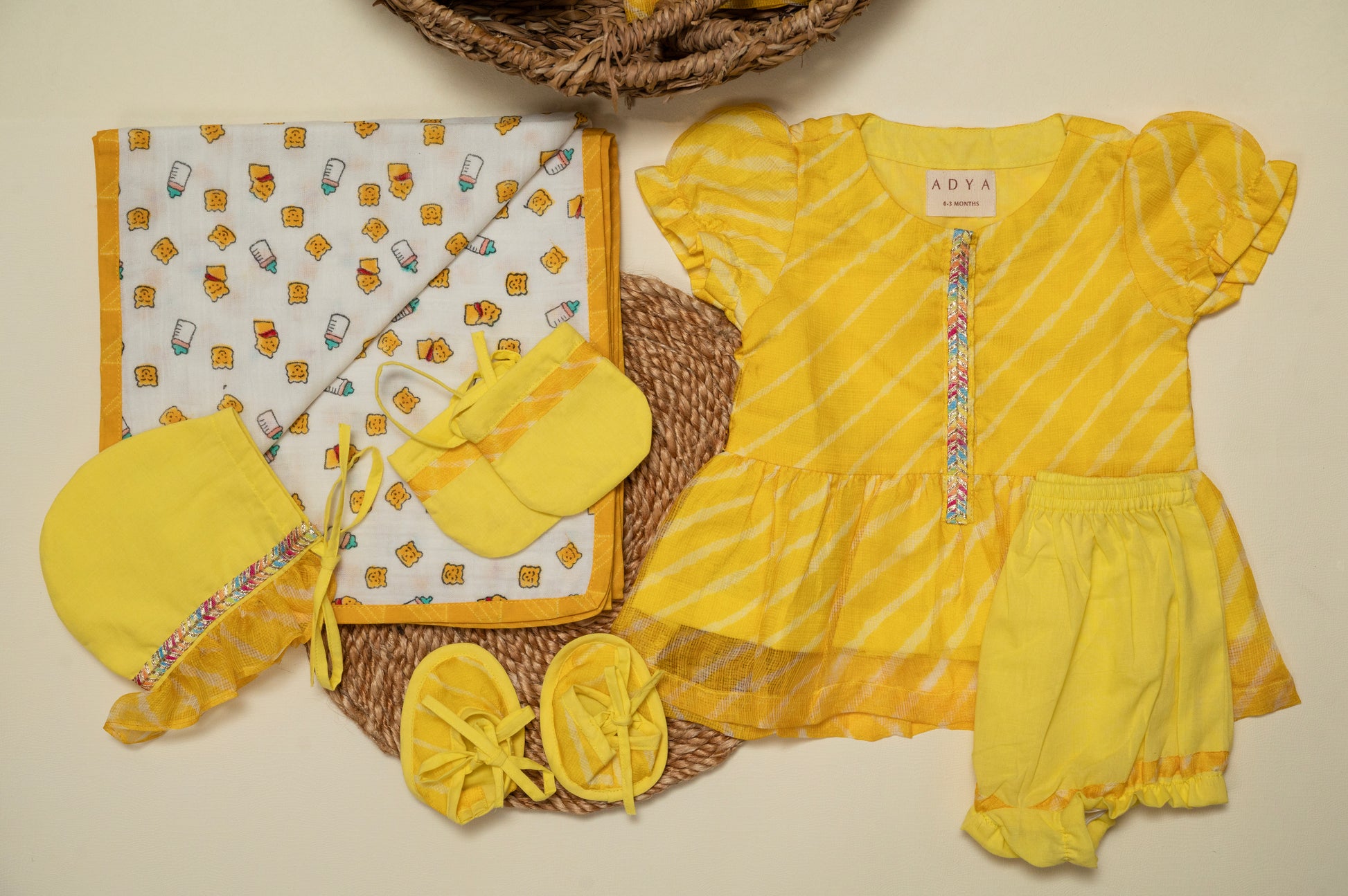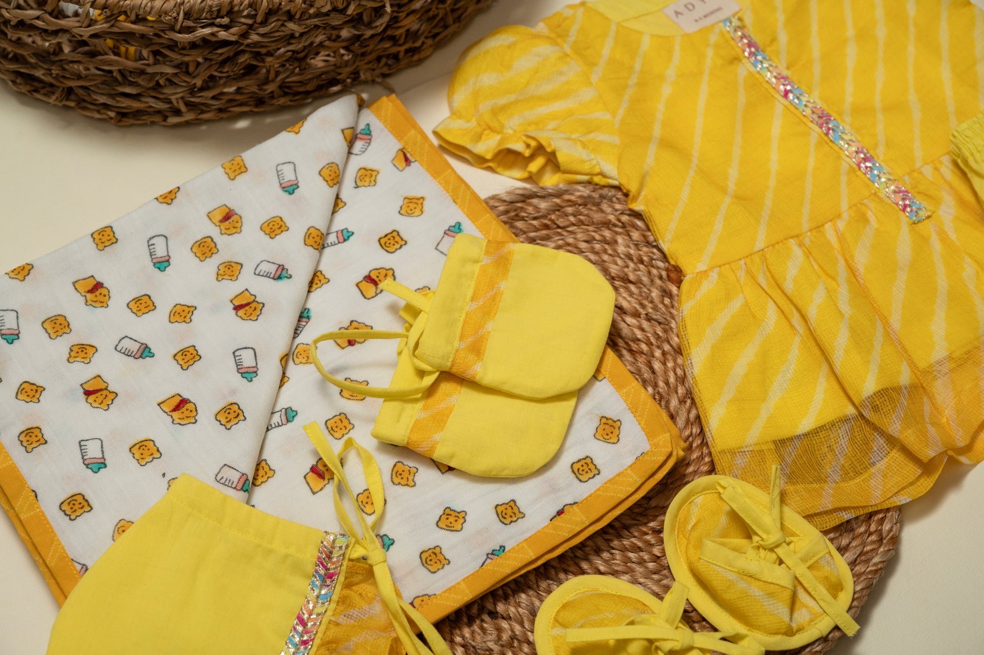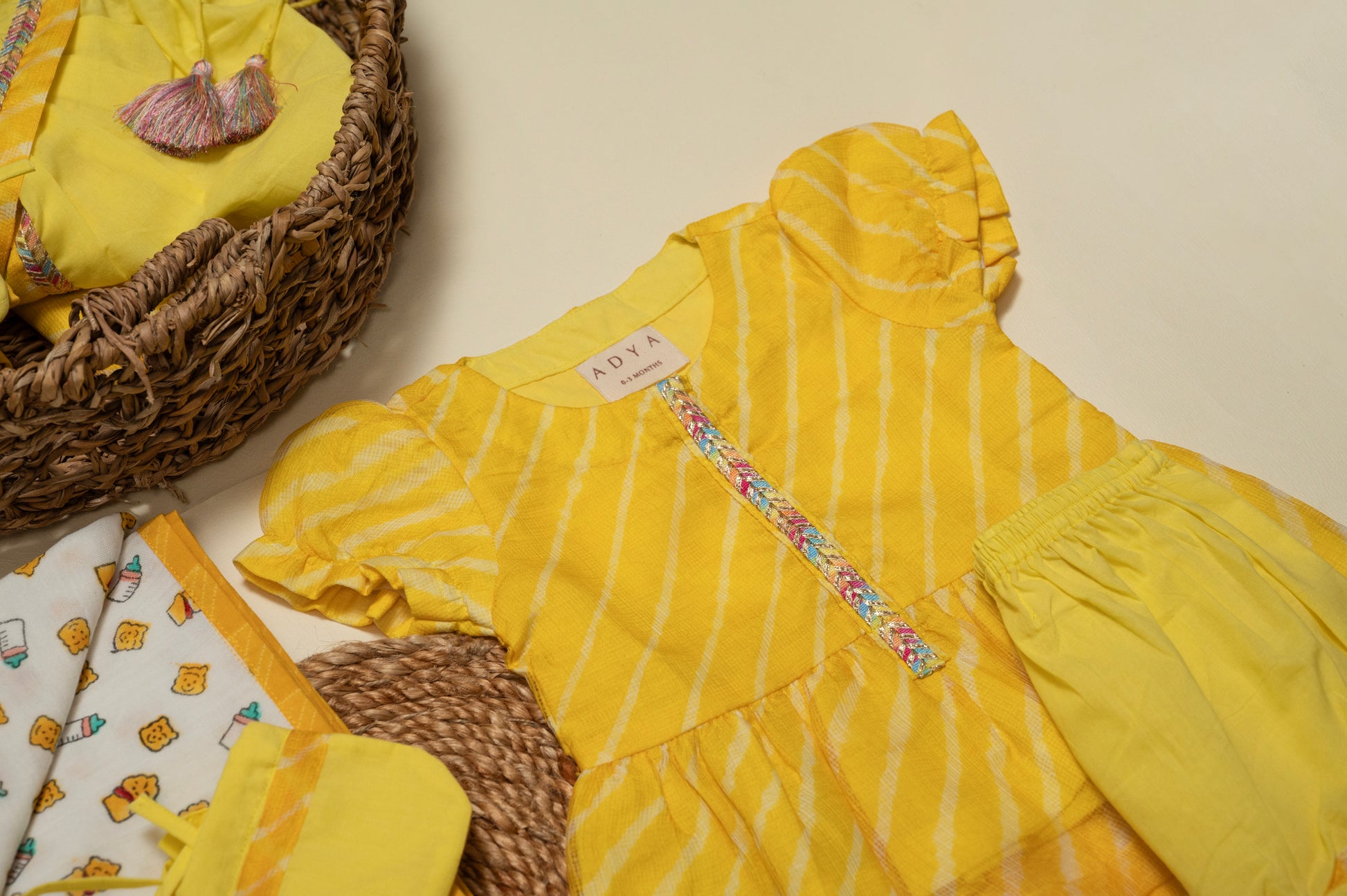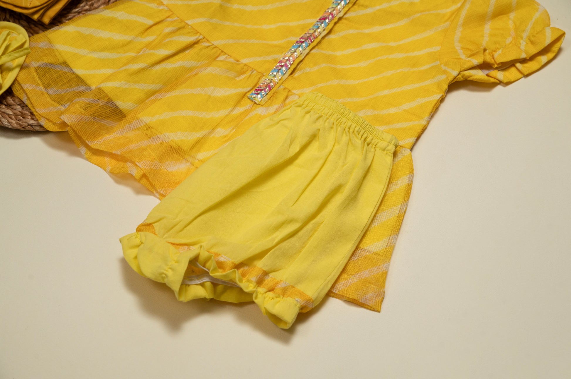 Leherya Frock & Bloomers: A dressy outfit that beautifully adorns your child, combining tradition with a modern twist. The vibrant leheriya print adds a splash of color, making your little one the star of any occasion.