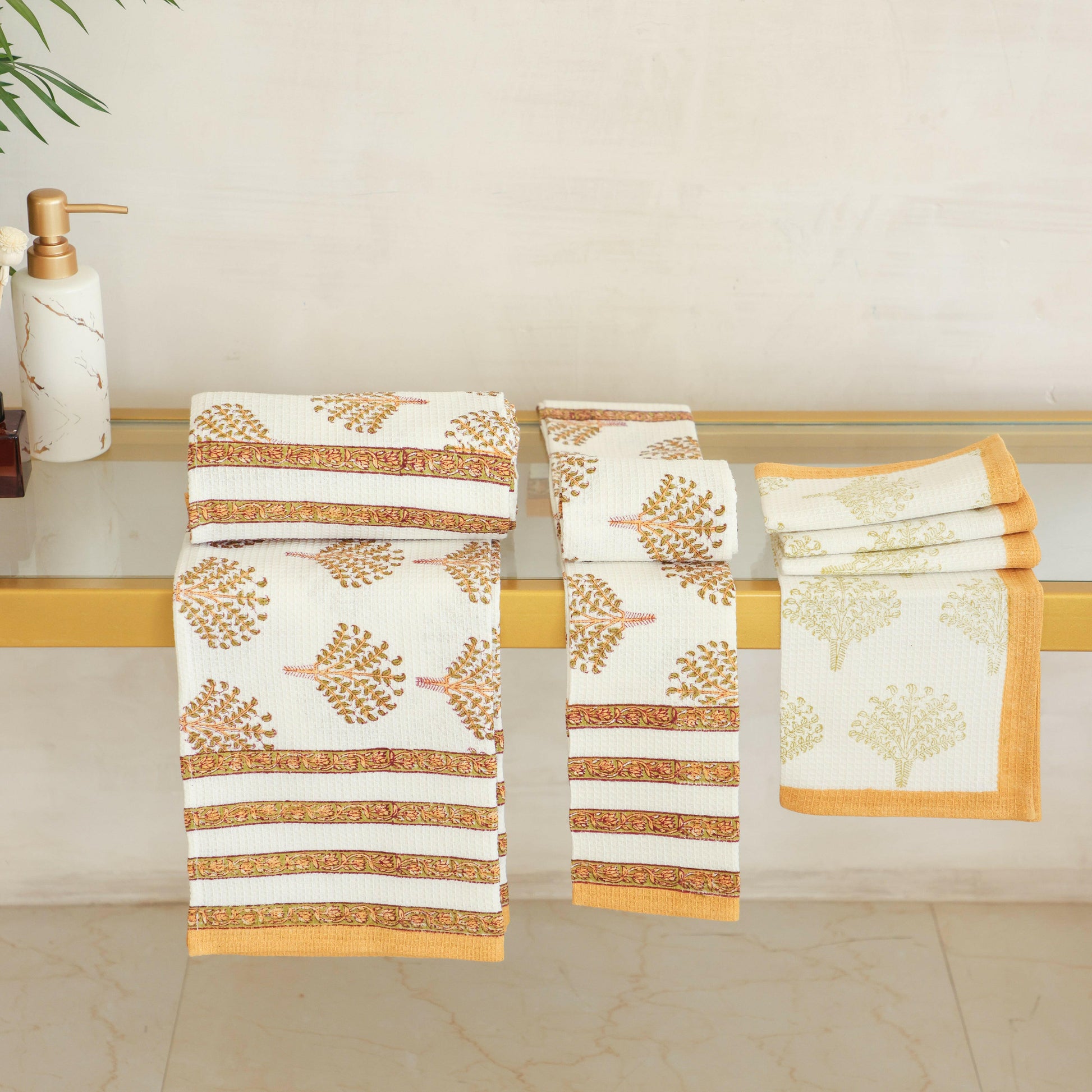 The hall mark of our towels is our distinctive palm tree texture, which not only adds a touch of sophistication but also enhances their absorbent capabilities.These towels not only elevates your bathroom aesthetics but also allows you to maintain their pristine effort with minimal effort.