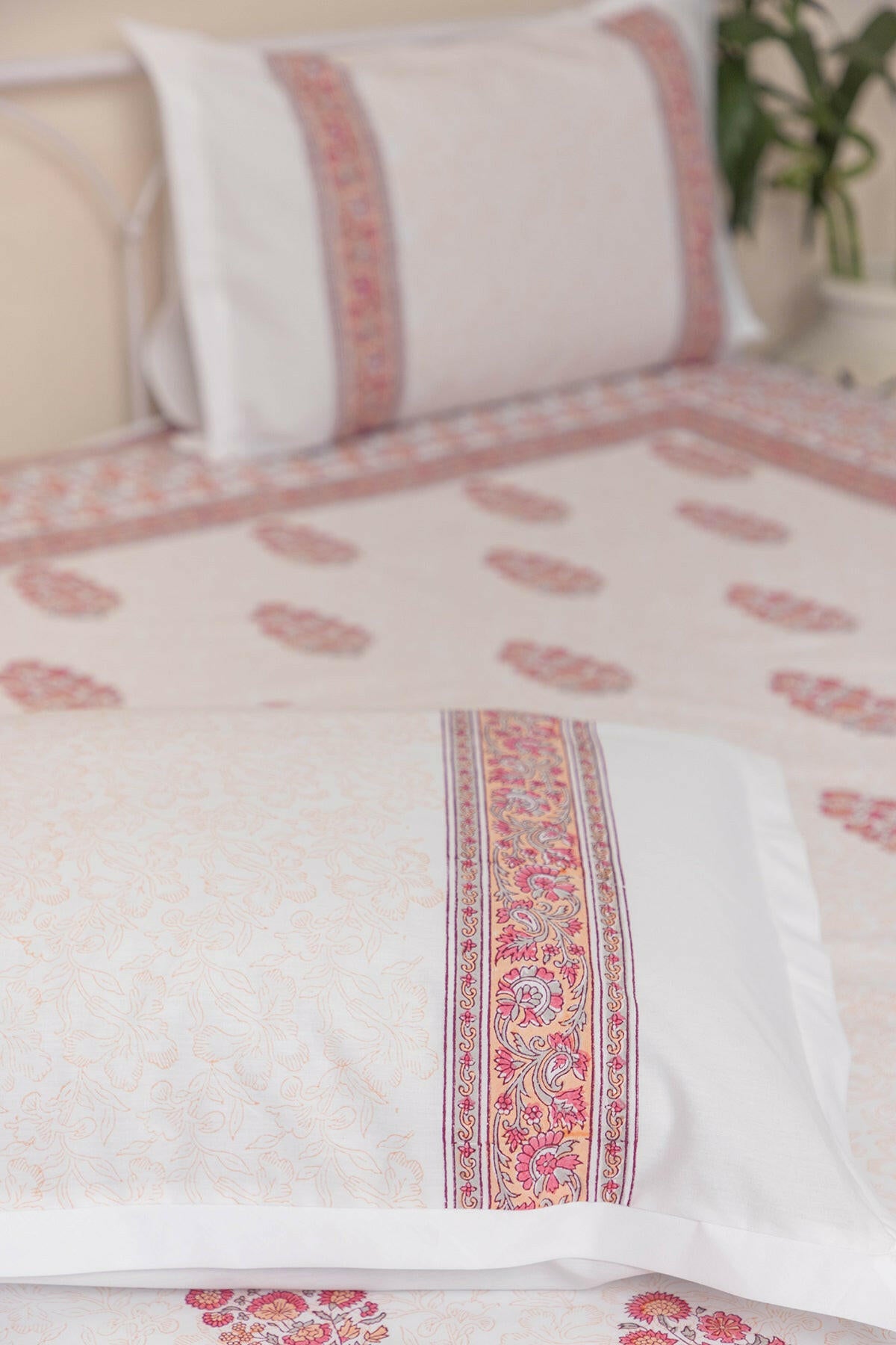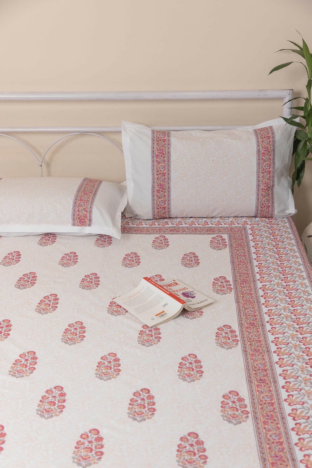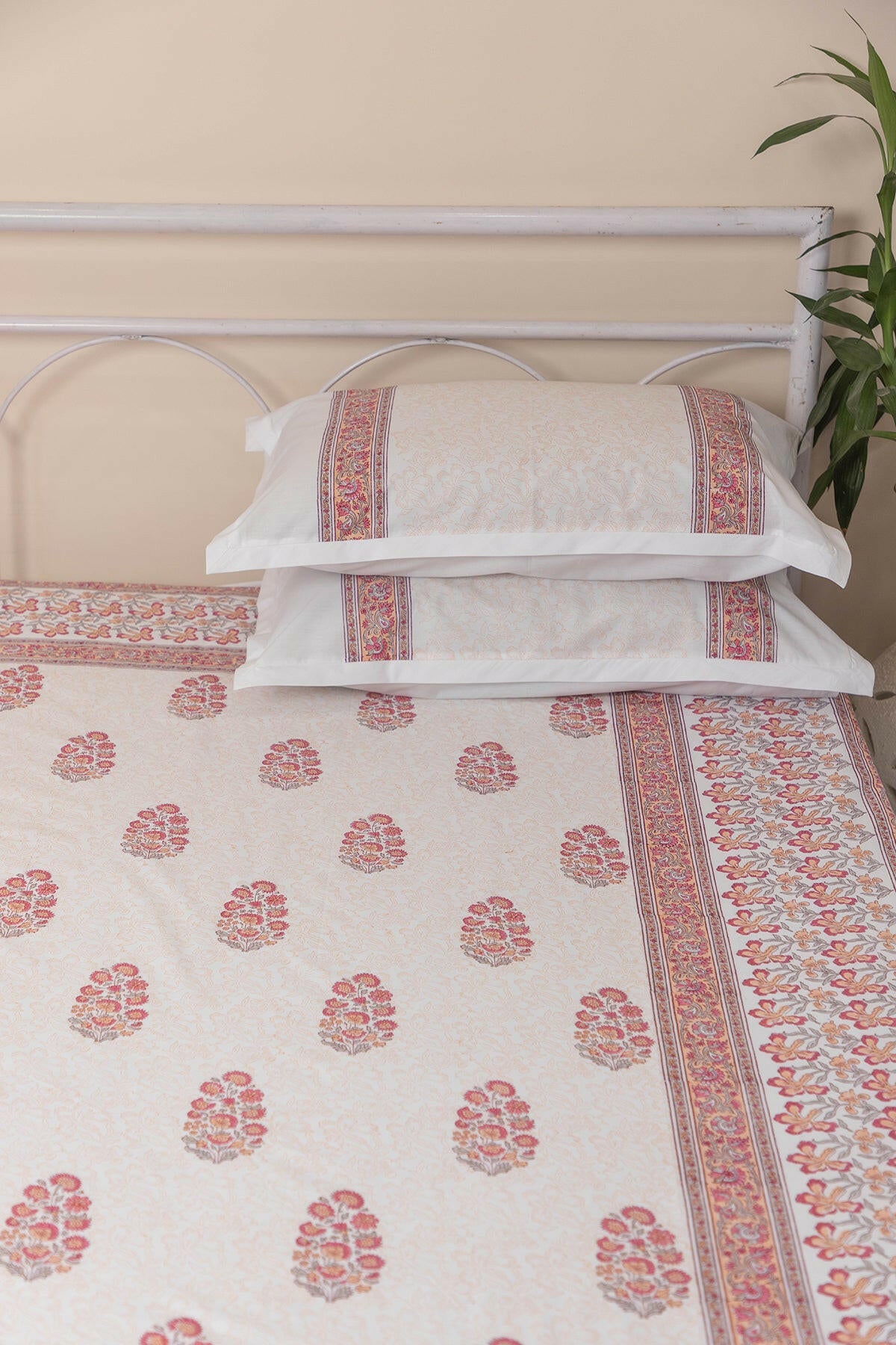 Experience the luxurious comfort of our 100% cotton bed sheet, beautifully hand-block printed with a variety of intricate designs. The bedsheet comes with matching pillow cases (18 IN X 28 IN).