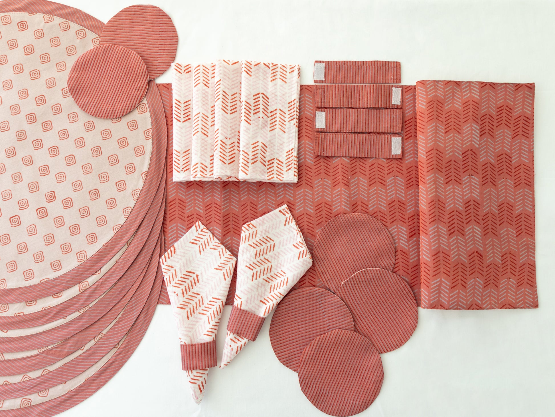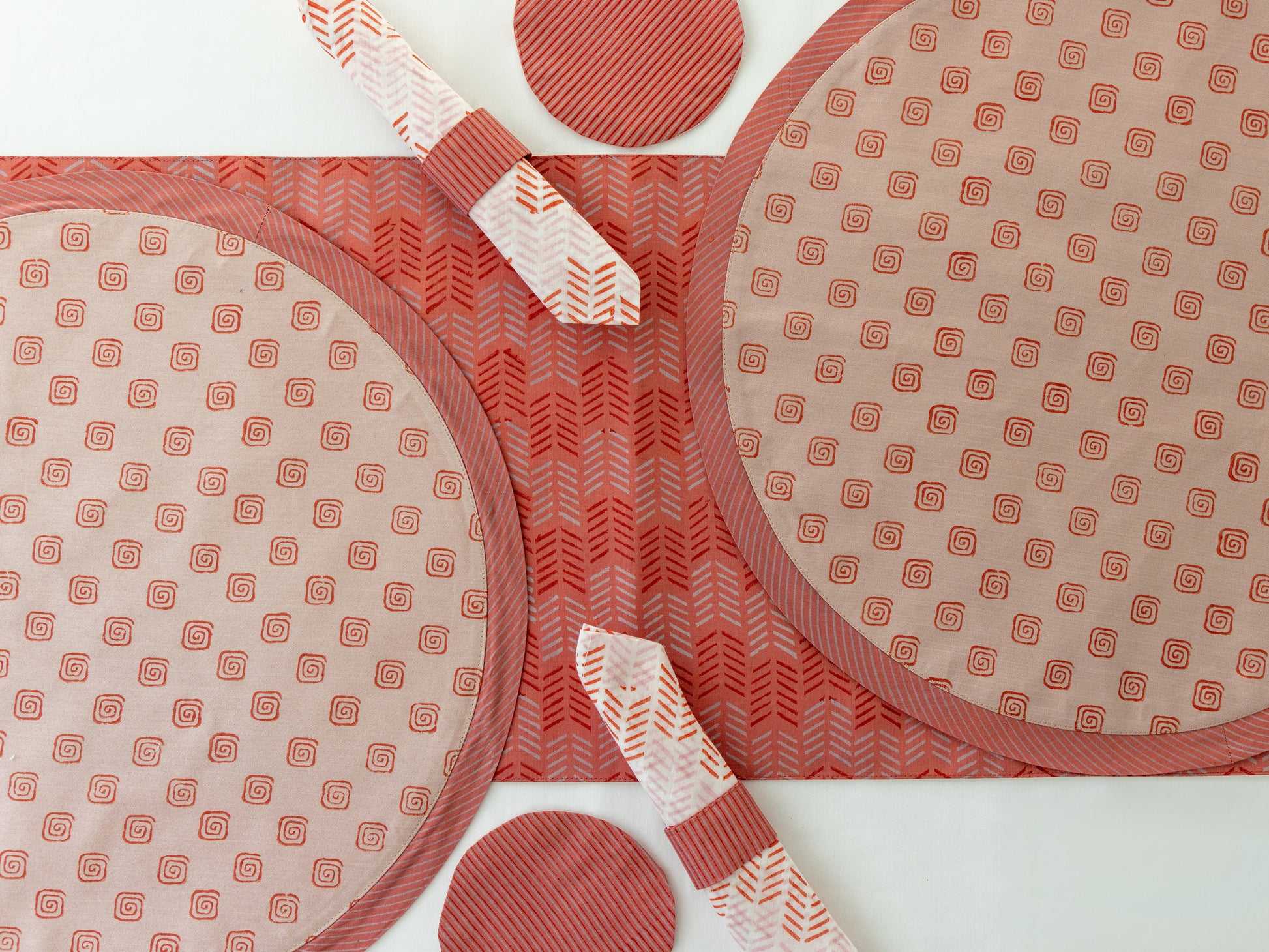 Contents: 1 Runner 6 Table Mats, 6 Napkins with 6 Rings & 6 Coasters