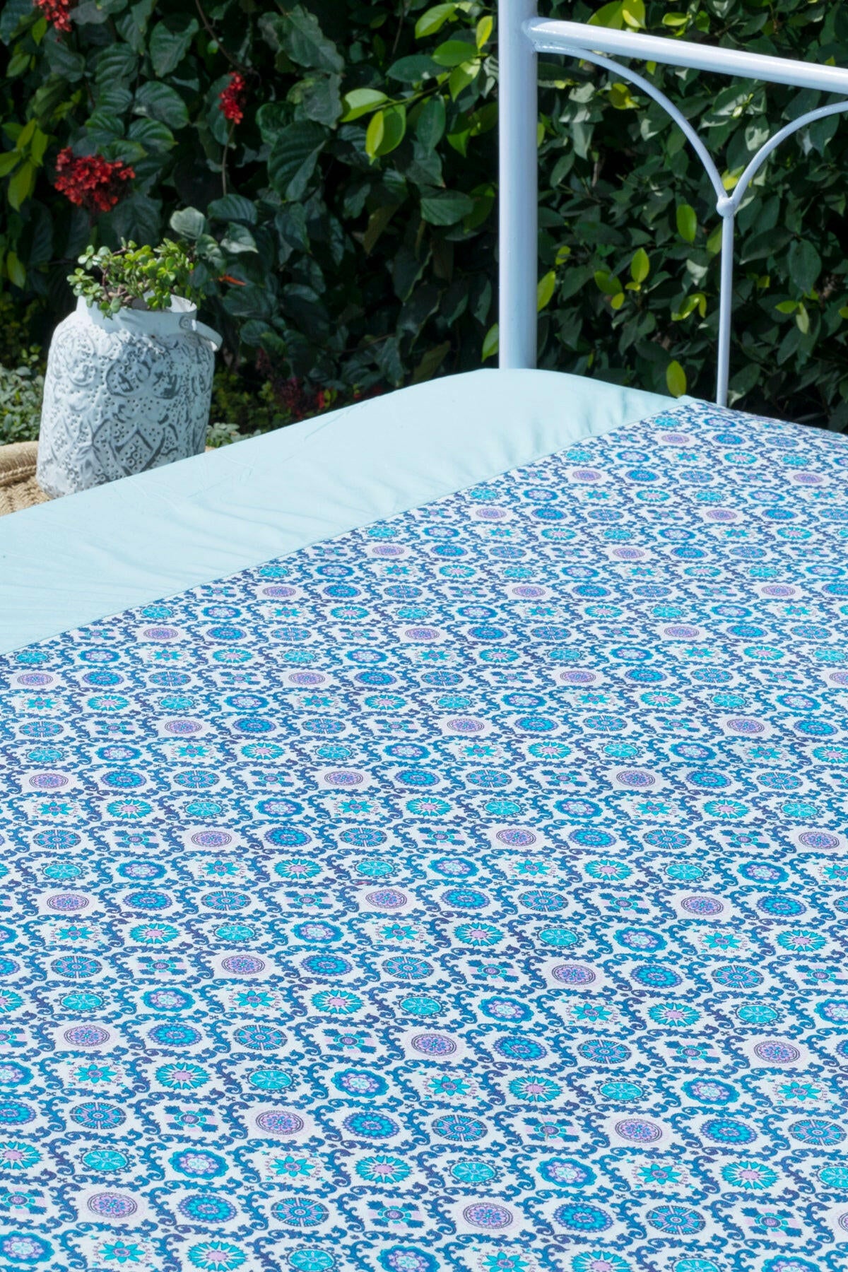 With a blend of design and comfort this bedcover is digitally printed with playful geometric patterns . Comes with two hand block printed cushion covers.