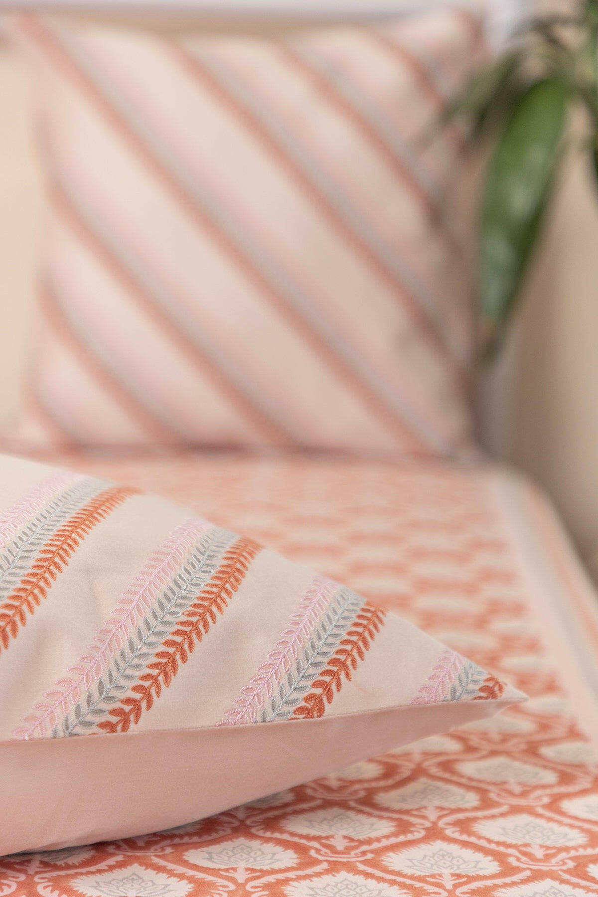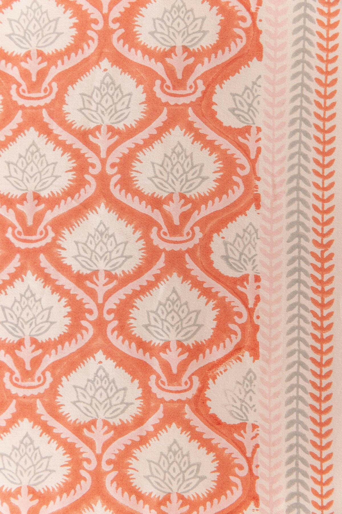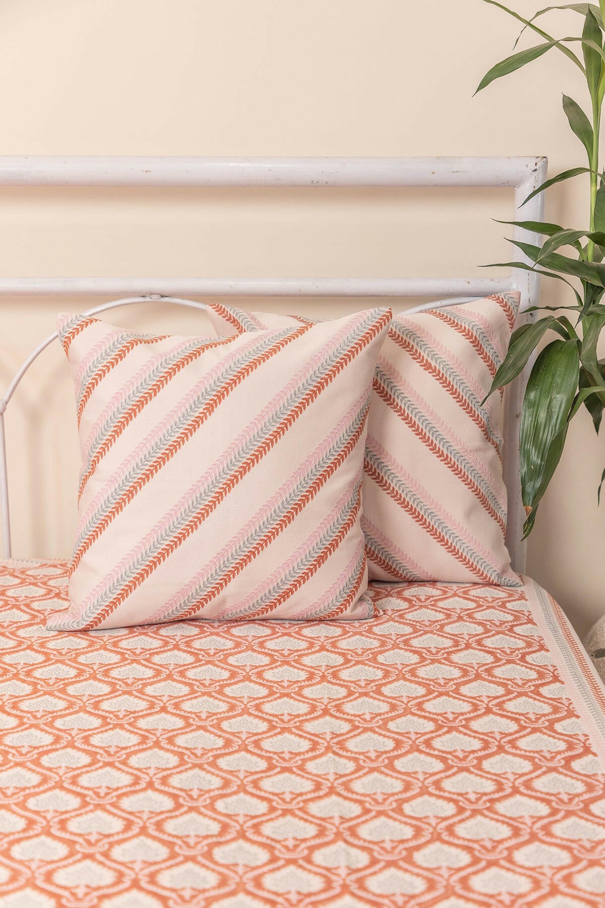 Creamy soft cotton bedcover intricately hand block printed with soothing flowers. Comes with two hand block printed cushion covers.