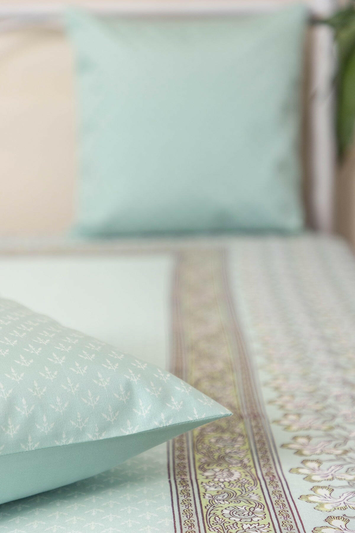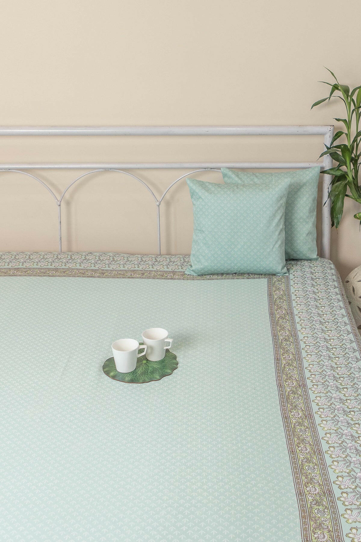 Creamy soft cotton bedcover intricately hand block printed with soothing flowers. Comes with two hand block printed cushion covers.