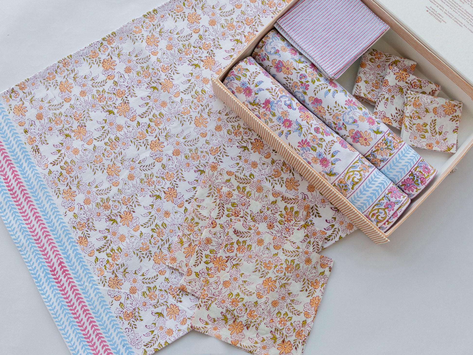Contents: 1 Runner 6 Table Mats, 6 Napkins with 6 Rings & 6 Coasters