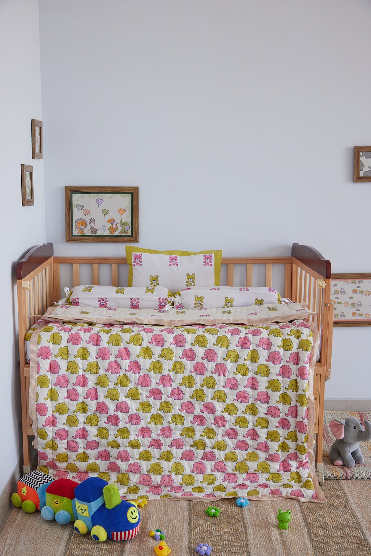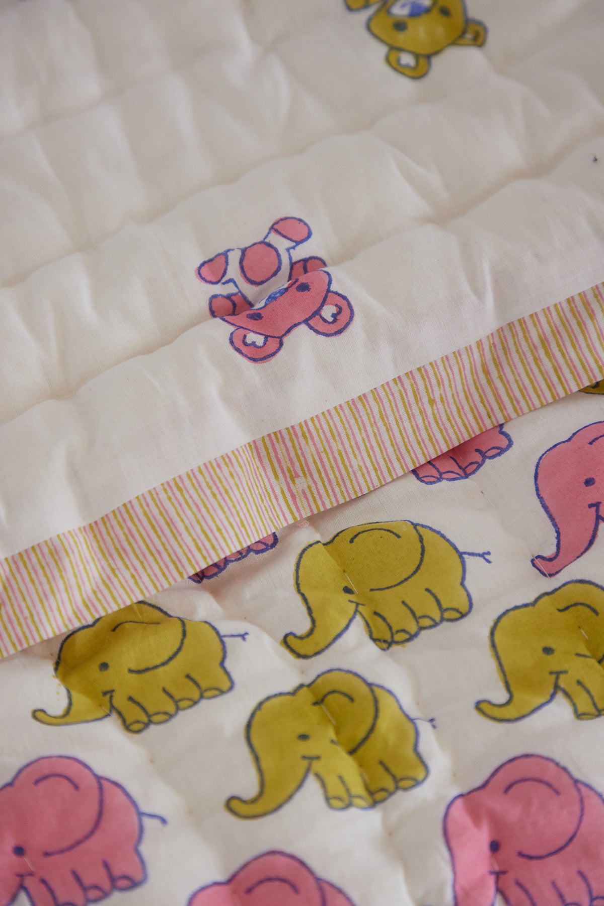 Embrace the magic of new beginnings with a touch of artistry and love. Envelop your little one in the cozy comfort of our hand-block printed soft quilt, crafted to bring joy and warmth.
