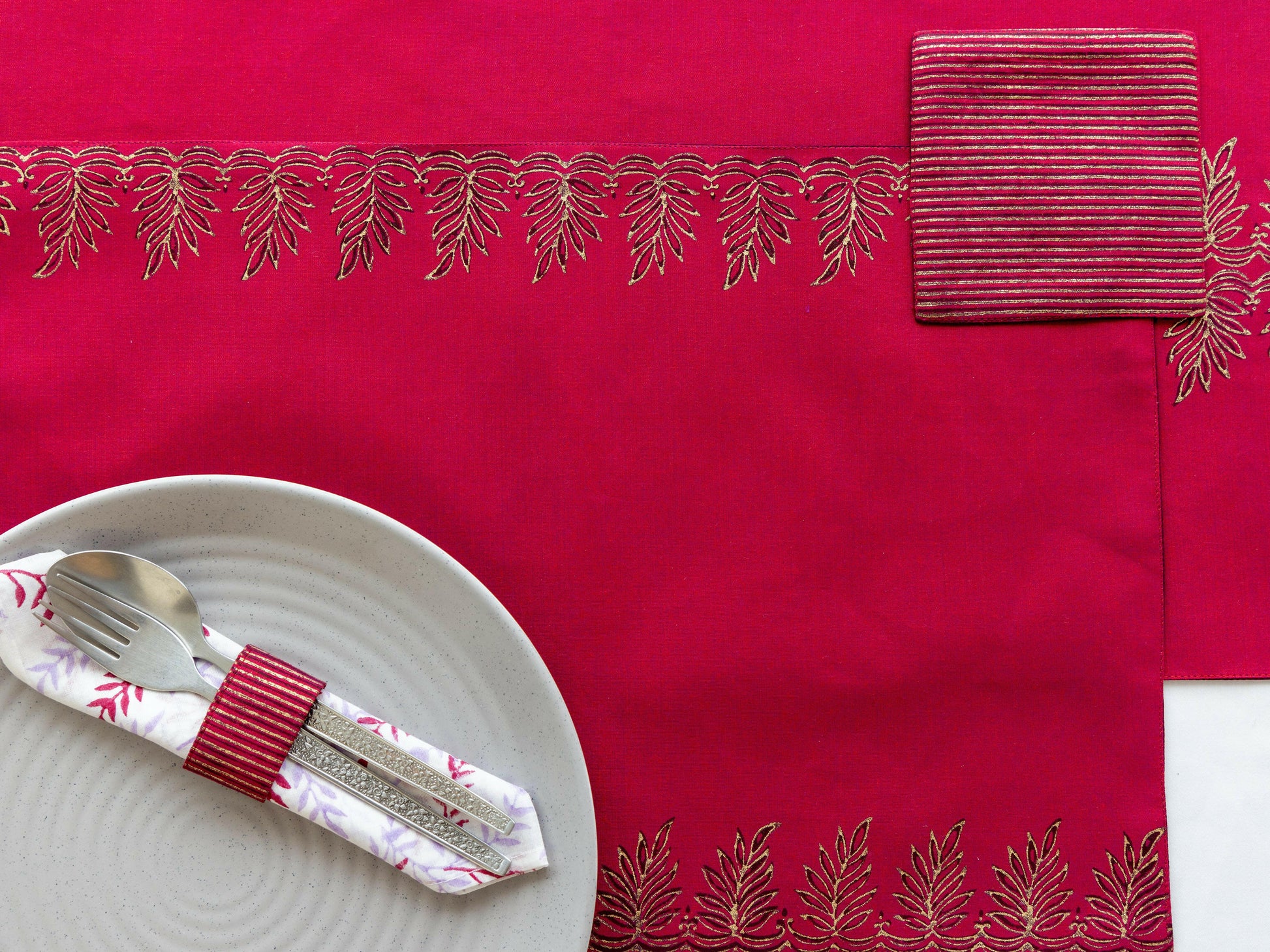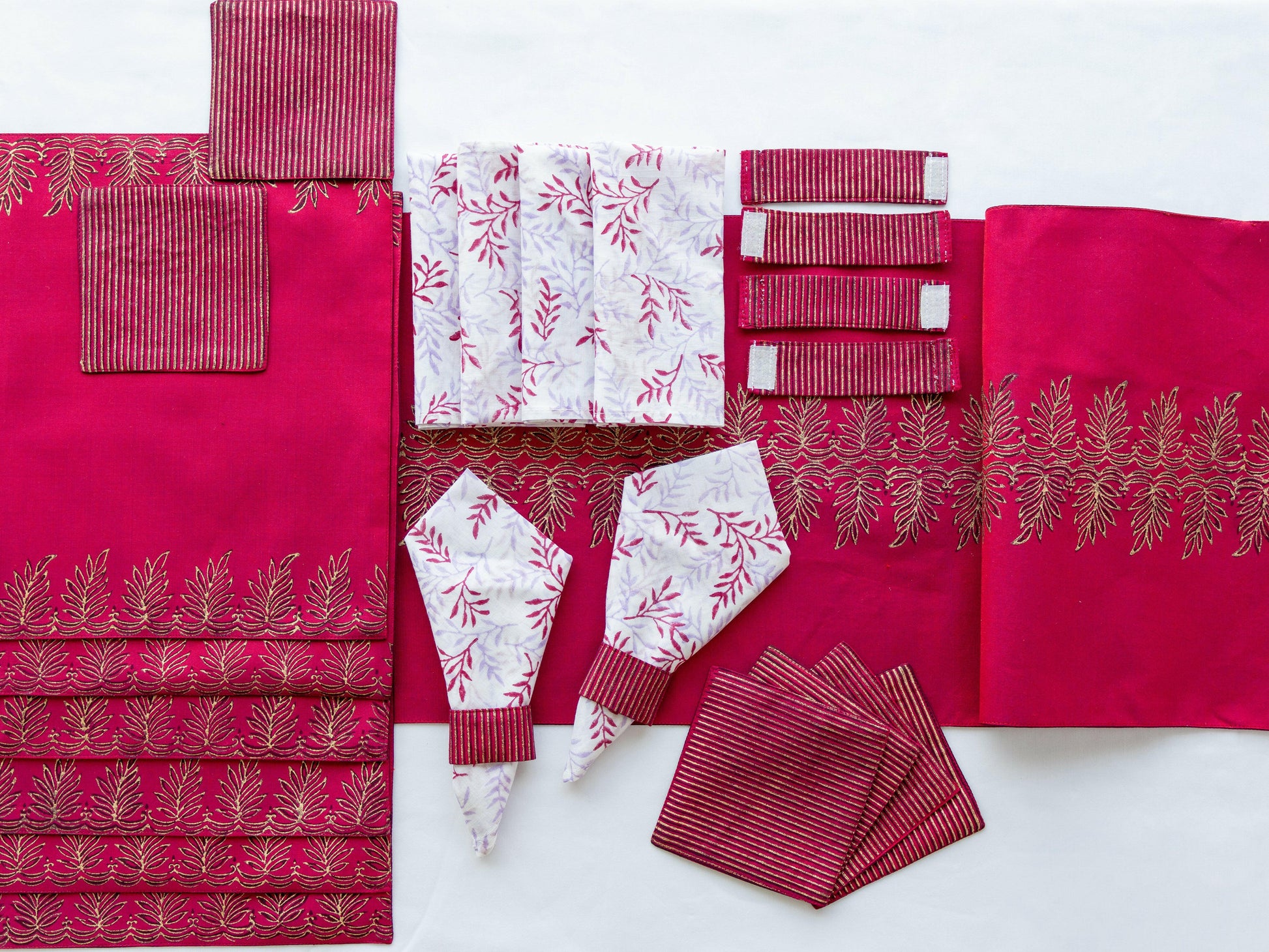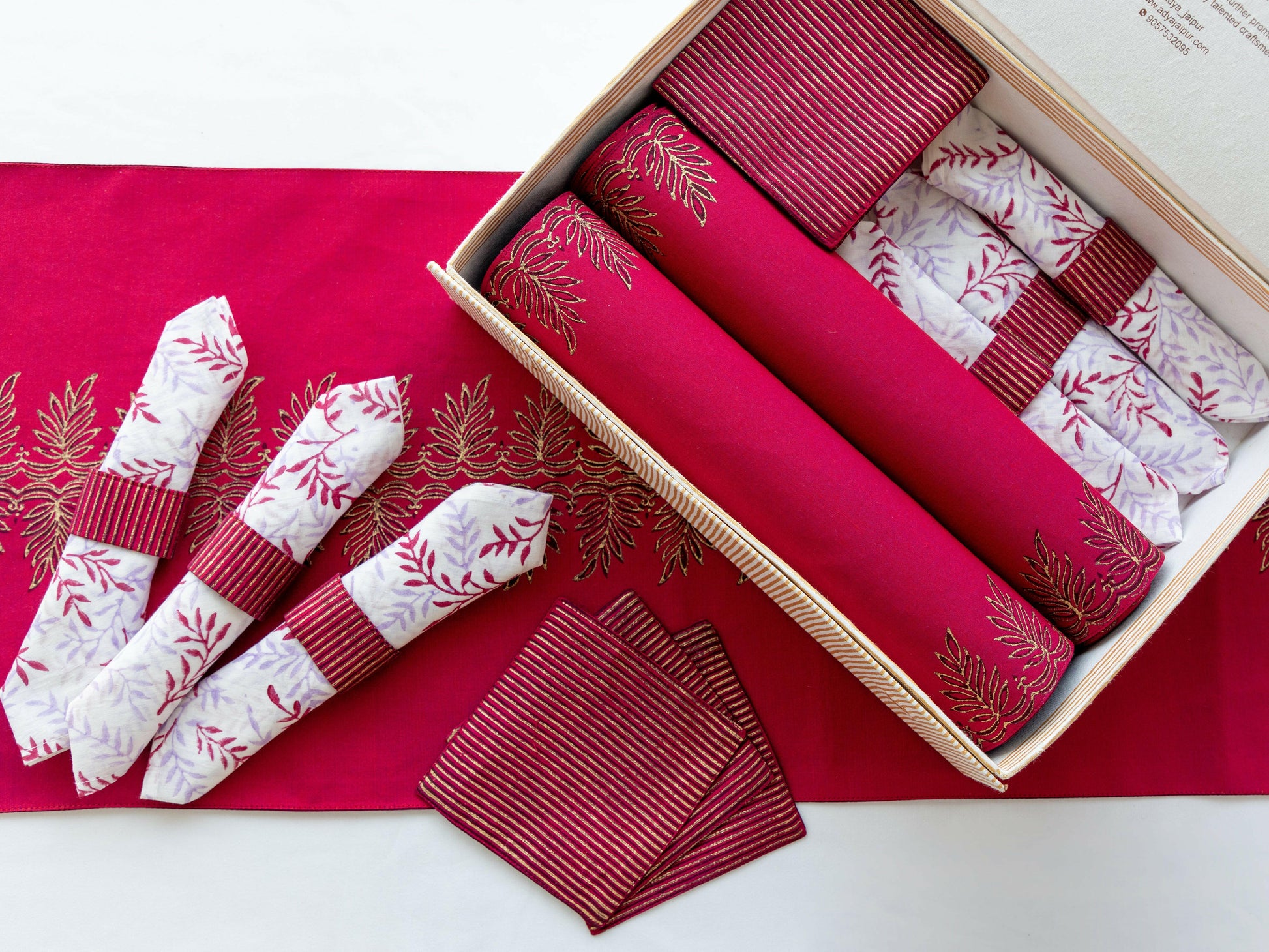 Contents: 1 Runner 6 Table Mats, 6 Napkins with 6 Rings & 6 Coasters